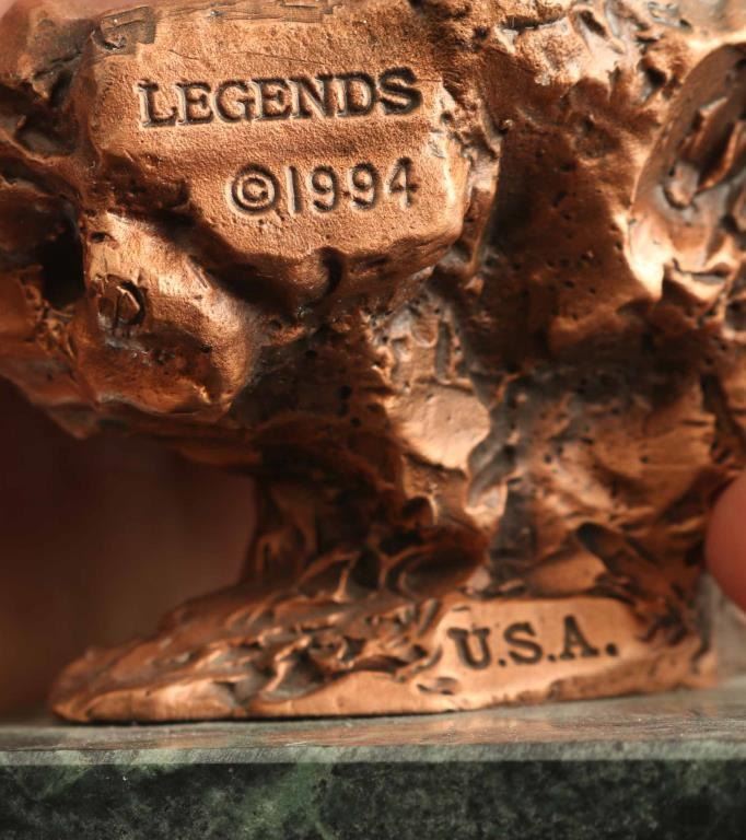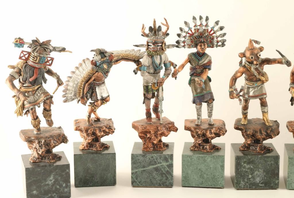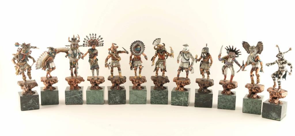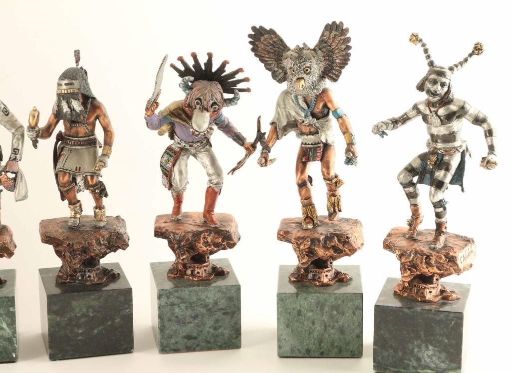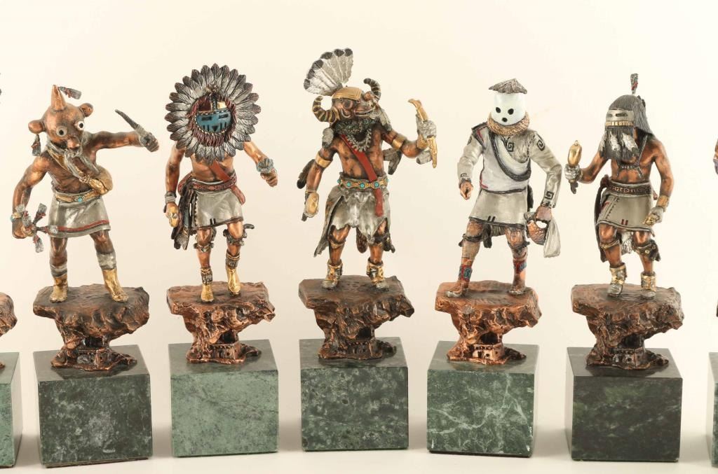 by CA Pardell all different kachinas Deer Kachina, Tawa, Palhik,Mana,Ahote,Kwahu,Angakchina,Etoto,Wiharu,Koyemsi,Mogwa,Koshari, and Hilihi, from the Legends series 1991-95 retail 4200.00 for set. Includes original boxes all numbered and signed. Range in sizes 10t"x2.5" approx on green marble bases.