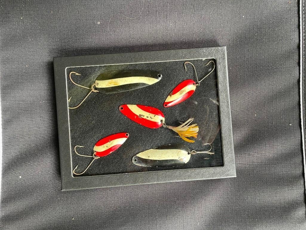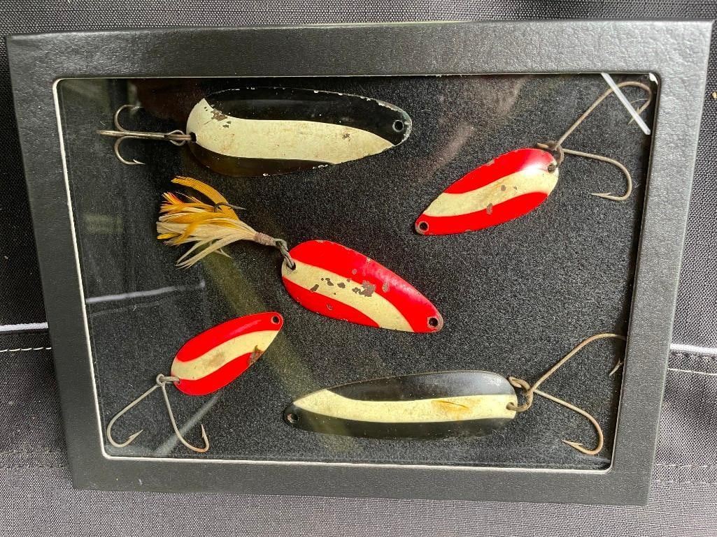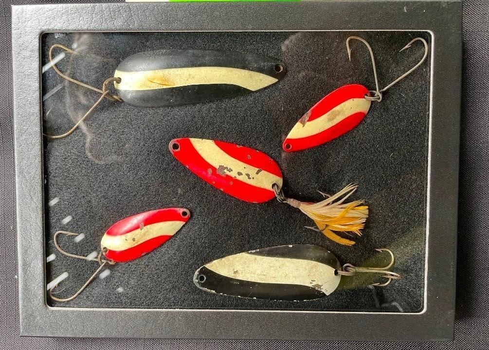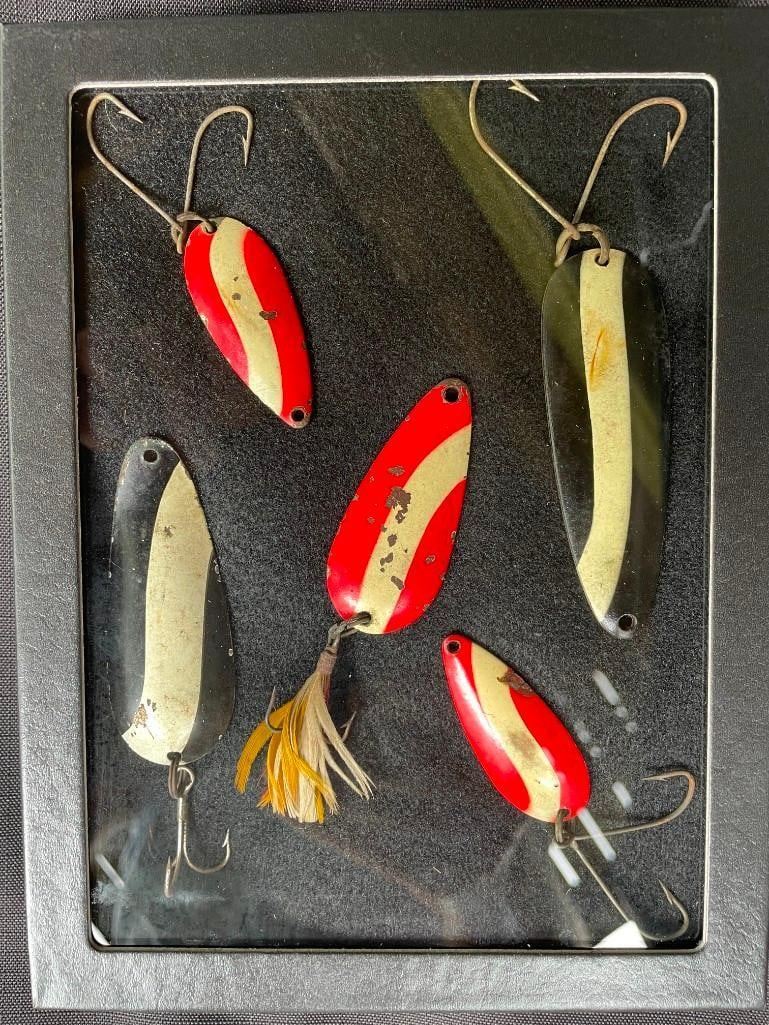 Set of 5 Old Fishing LURES/SPOONS from the 1940's-1950's. They are in a nice Display Case that measures 8.25" Long x 6.25" Wide. (ONE$) COLLECTIBLE FISHING LURES