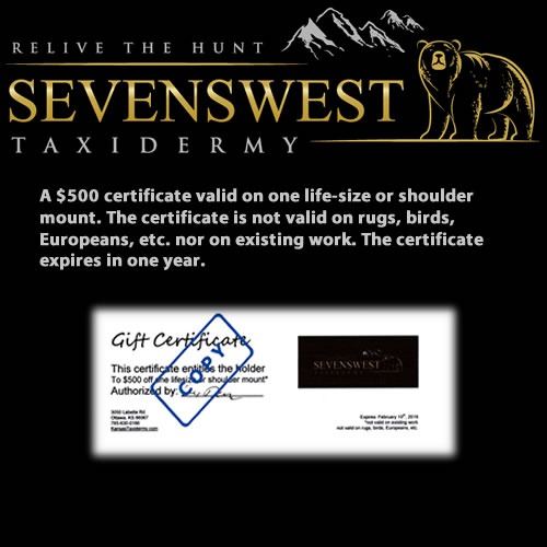 A $500 certificate valid on one life-size or shoulder mount. The certificate is not valid on rugs, birds, Europeans, etc. nor on existing work. The certificate expires in one year.