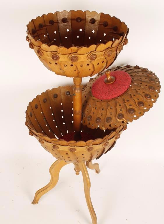 All wood construction with upper and lower baskets for storing project materials. Upper basket has lid and spool dowels inside to hold yarn or thread. Measures 40"x15 1/2".