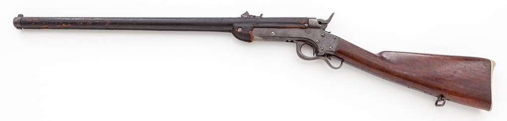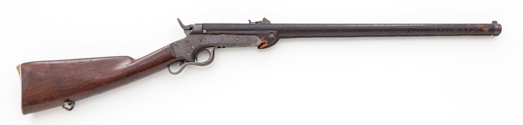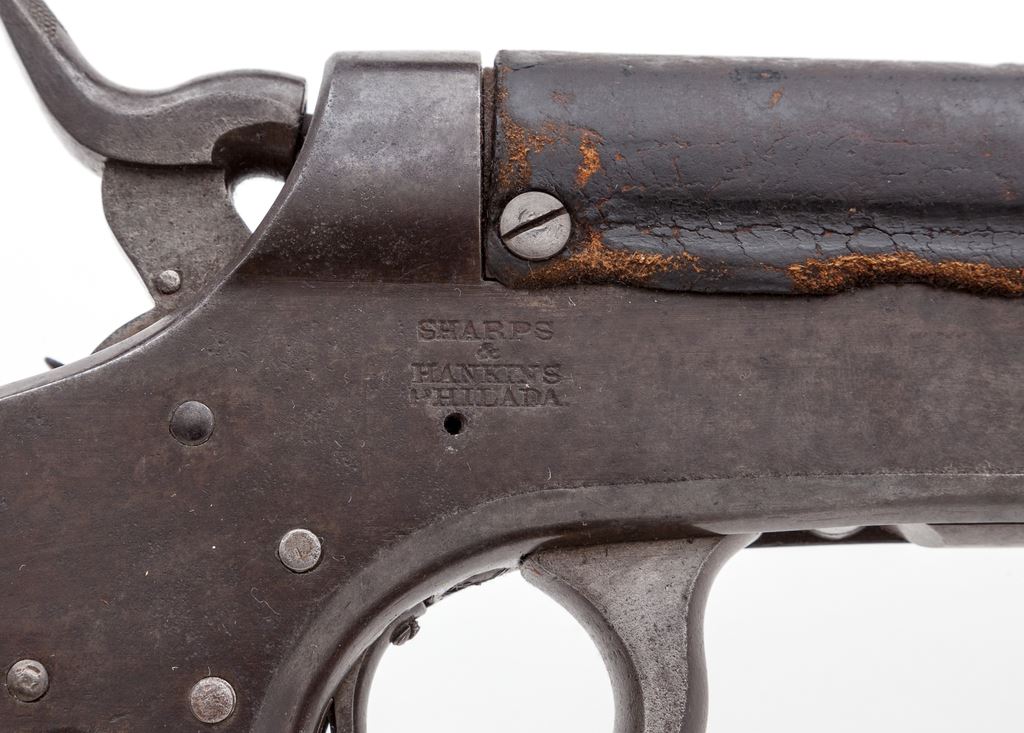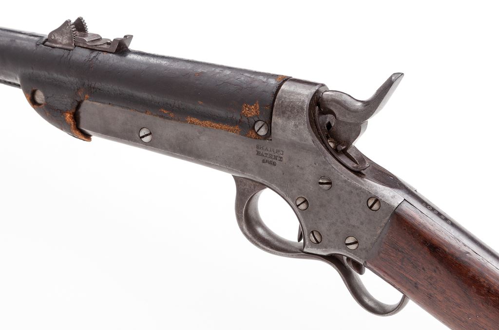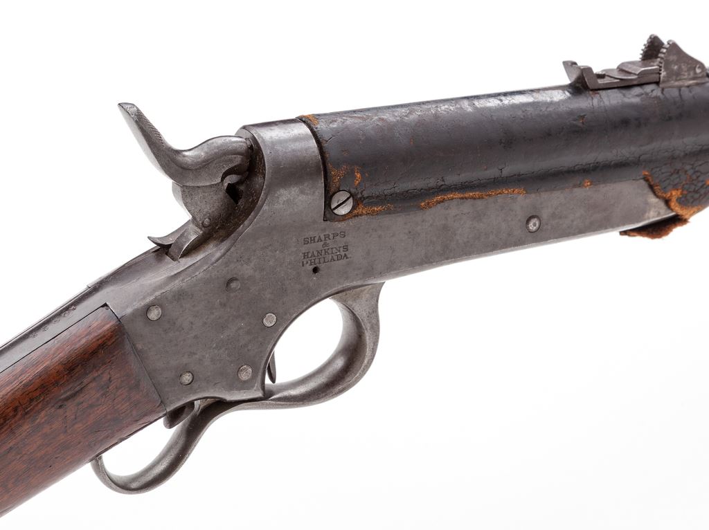 Sharps & Hankins Model 1862 Single Shot Naval Carbine, #10923, .50 RF cal., 24'' barrel with black leather covering, blue finish, walnut stock, with brass buttplate and correct single sling swivel. Left side of frame marked ''Sharp's Patent/1859''; right side marked ''Sharps & Hankins/Philada''. Mfg'd between 1862-1865 with just 6,686 going to the Navy. Condition is fine. Frame has toned silvery gray, but leather remains mostly intact, with the only real loss to the area just forward the lever. Stock with light general scratches and possibly an additional coat of lacquer at one point. Good functioning action, with complete and interesting original front and rear sights; bore is fair. Est.: $1,800-$2,400. (Antique)