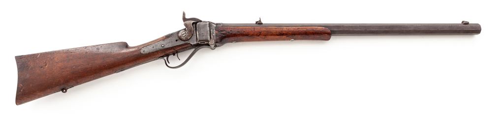 Sharps Meacham-Type Conversion of New Model Civil War Percussion Carbine to Cartridge Sporting Carbine, likely by Axel W. Peterson of Denver, circa late 1880s, with two-line Peterson marking stamped on bottom barrel flat ahead of forestock, #C7709, .45-70 cal., 24.5'' heavy octagonal barrel, two-line Sharps 1852 patent date on right side of receiver, Sharps 1848 patent date in two lines on left side. Double set triggers. Top barrel flat has hole drilled for unknown purpose ahead of adjustable buckhorn rear sight. Originally finished in blue and case hardened metal. Oil-finished walnut stocks, sling bar and ring removed, steel crescent buttplate. Weight is 12 lbs. Condition is very good having a smooth age patina mixed with some original barrel blue with battering to upper receiver tang; case hardening has mostly silvered out. Stocks were reworked from rifle stock, are solid showing age, use and minor losses. Action is tight and crisp. Bore is bright. Est.: $1,500-$2,000. (Antique) (Joe Poyer collection)
