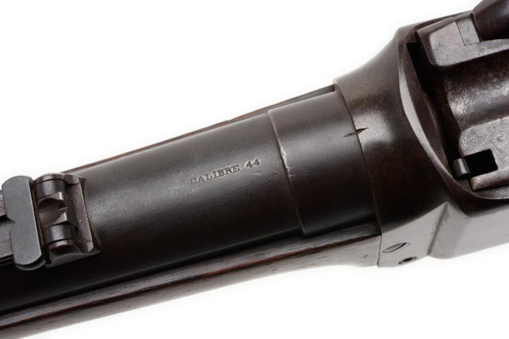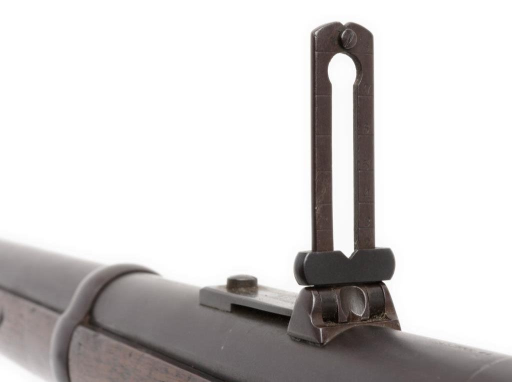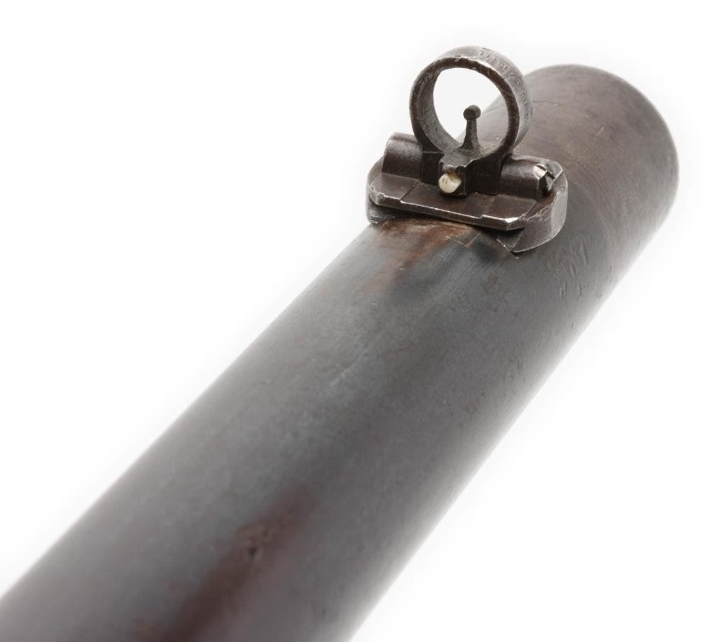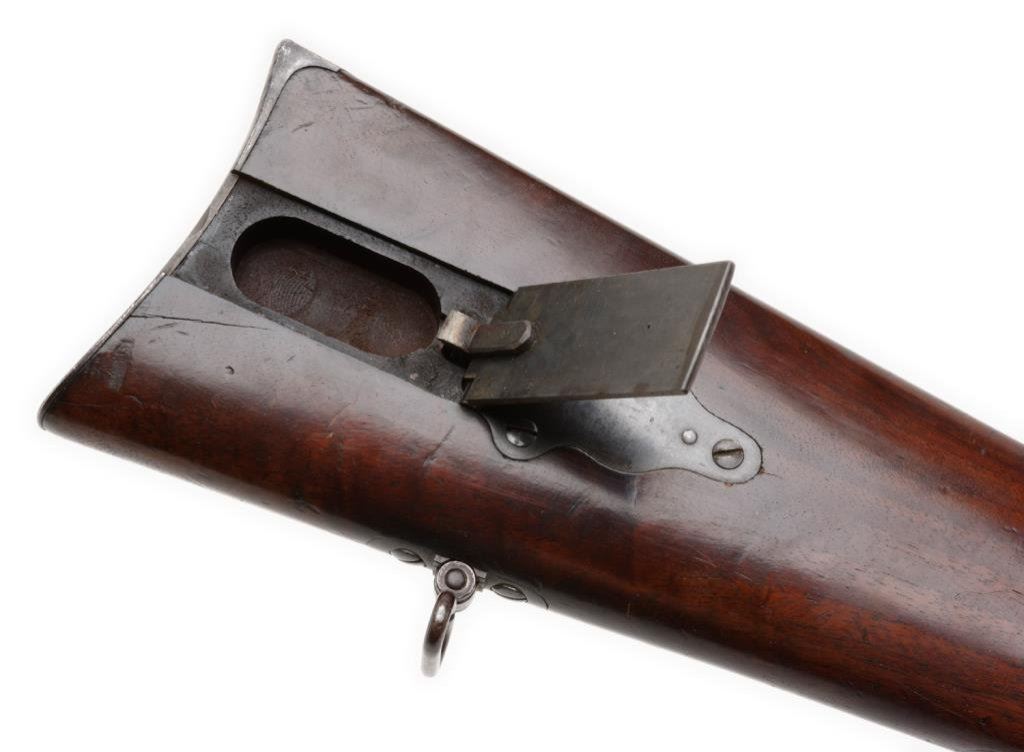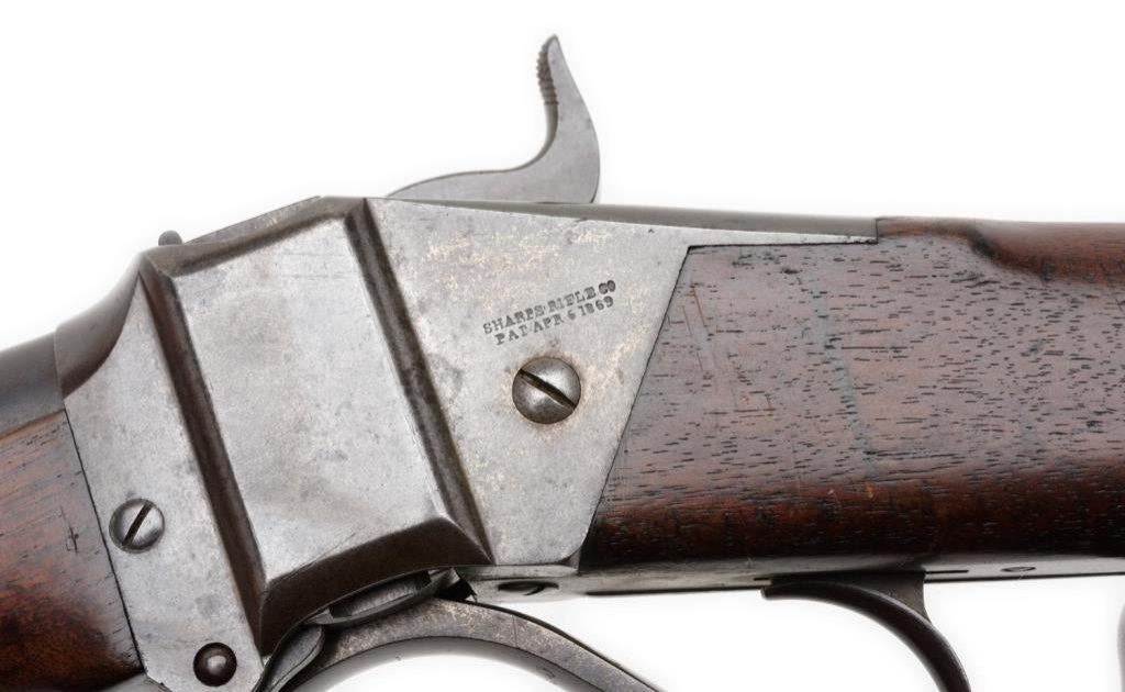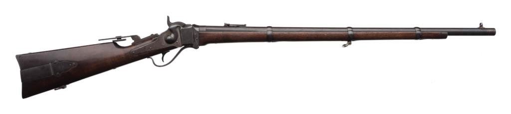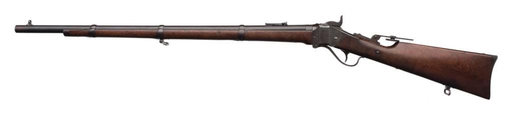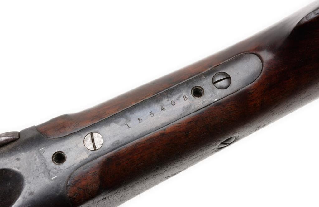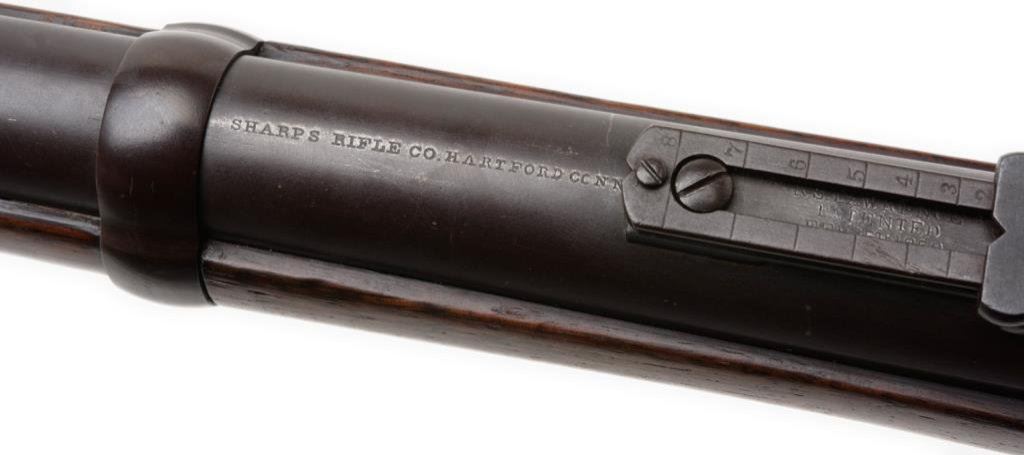 Sharps Model 1874 military rifle, .44-77 caliber, 30” round barrel, S/N 155403, blued and case hardened finish, wood stocks with iron patchbox in butt stock, three barrel bands, flip-up front Beeches sight; adjustable flip-up peep tang sight. This rifle is in overall very good to fine condition displaying the majority of its original blue on the barrel and considerable silver toning on the receiver; crisp action, sharp markings, very good to fine bore, very good + wood stocks. Accompanied by an important factory letter and additional period documents. The 1985-dated letter from the late Dr. R.L. Moore, indicates this military rifle was invoiced on October 15, 1875 to P.H. McQuinn of Wilkes Barre, PA., confirming caliber and barrel length. Also included are original letters to the Sharps Rifle Company from a 1st Lieut. P. H. Mc Guire, one on Vulcan Iron Works letter head and dated Oct. 4, 1875, indicating “we have organized a independent rifle Company known as the Sarsfield Guards and we are thinking to adopt your metallic cartridge rifle providing we can agree on the price of them . I would like if you would send me one immediately the company is desirious (sp) of