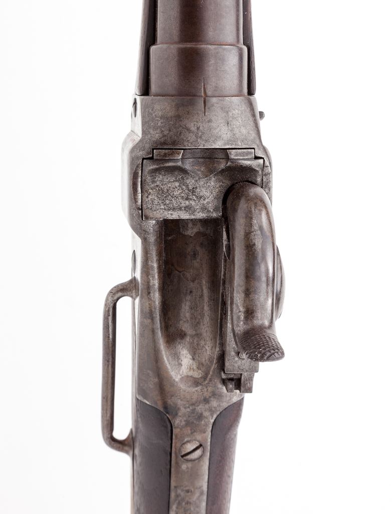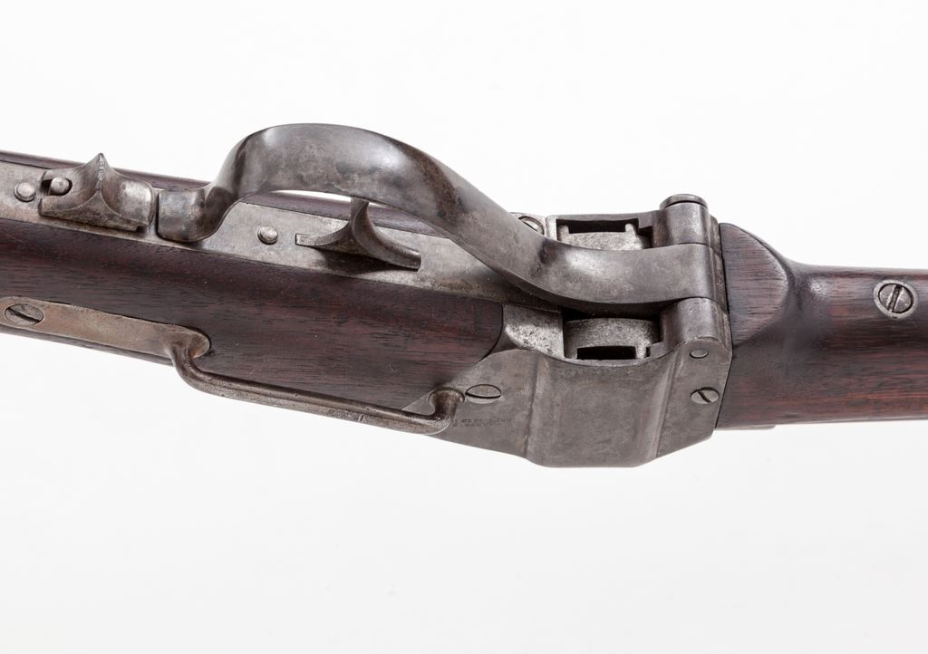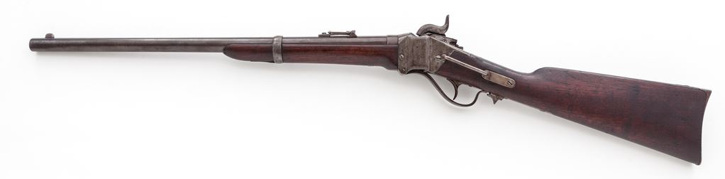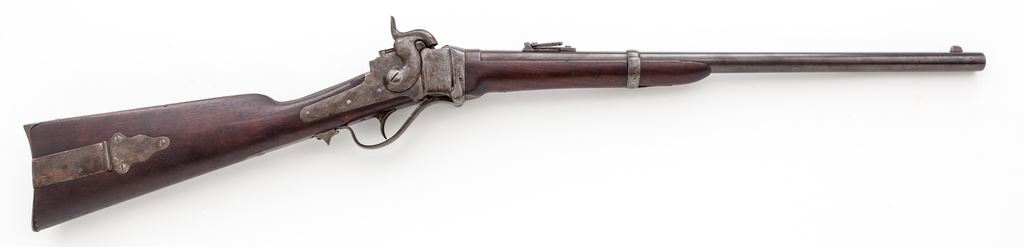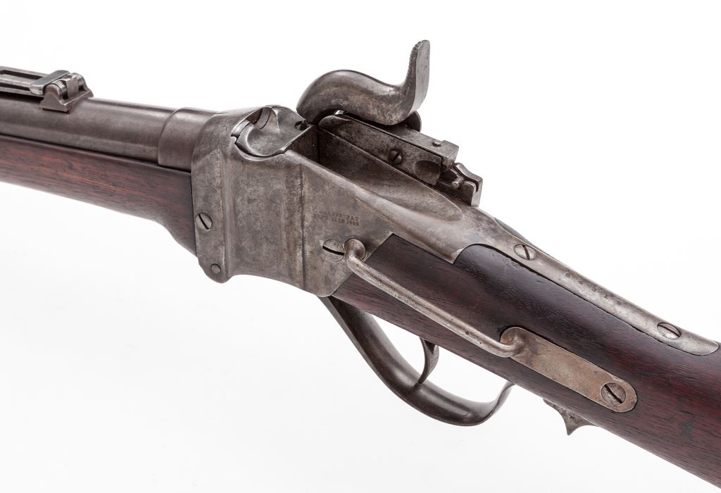 Sharps New Model 1859 Civil War Percussion Carbine, #64319, .52 cal., 22'' round barrel, Sharps and Lawrence (for the integral pellet priming system) patent dates on right side of receiver, Sharps date additionally marked on left side. Originally finished in blue and case hardened metal. Oil-finished walnut stocks with faint ''ESA'' inspector's cartouche under left side sling bar, case hardened patch box, steel crescent buttplate. Condition is fine having a smooth age patina mixed with some original barrel blue; case hardening with muted colors but there. Wood is smooth and solid showing only minor use and age. Action is tight and crisp. Bore is bright. An original and desirable military Sharps carbine. Est.: $3,000-$4,000. (Antique) (Joe Poyer collection)