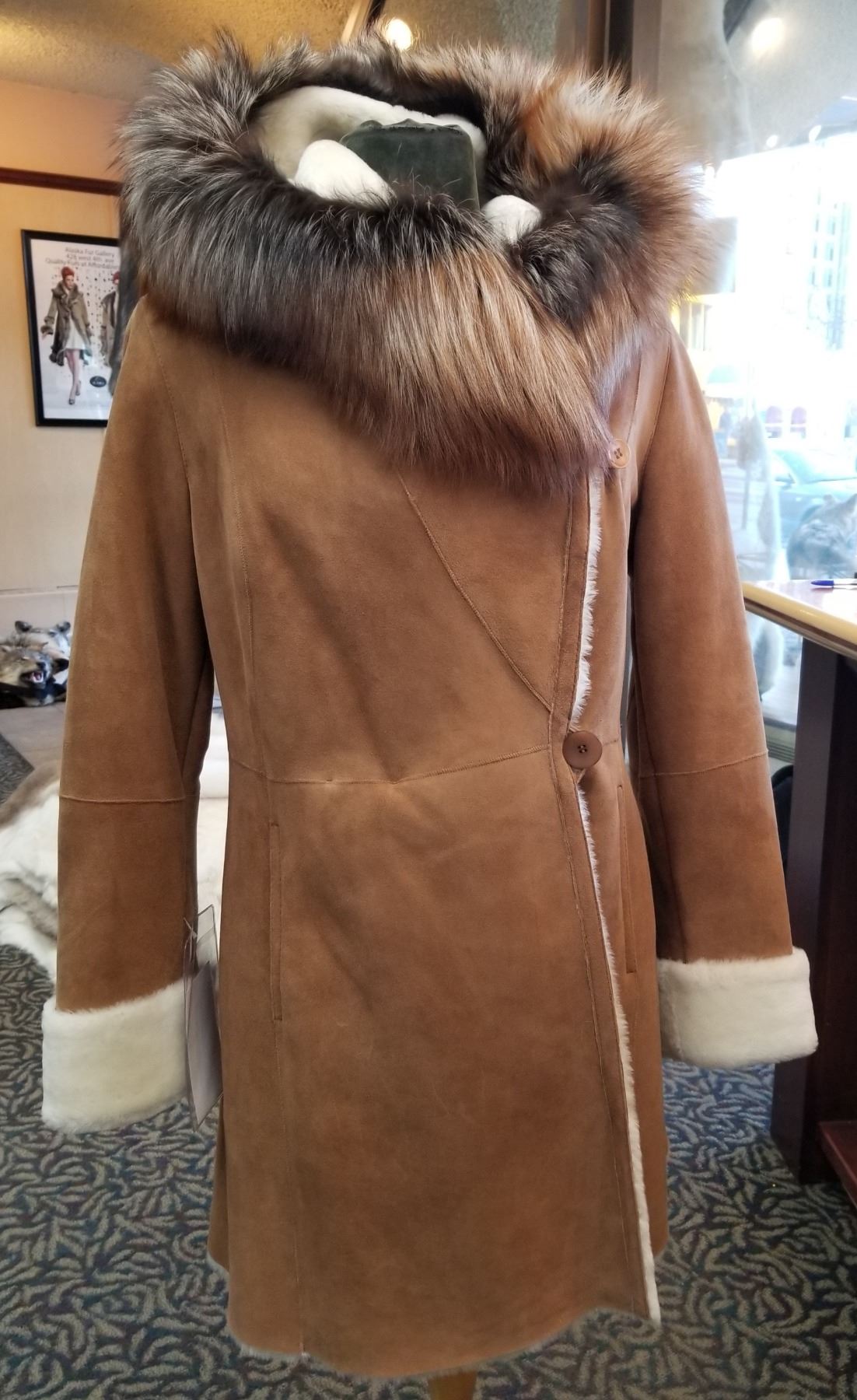 Fur Coat: Alaska Fur Gallery of Anchorage has donated this beautiful Shearling Stroller that is stylishly designed to be both flattering and functional, shielding you from the coldest of weather while looking great. This feminine leather stroller dresses up your everyday casuals and fashions you for an evening out. Supple lambskin leather is topped by a cozy hood. The hood is lavished in silver fox fur for a glamorous finish and the cuffs are rolled. The flattering look provides two side pockets and two buttons closure. Size Exchangeable. For over 70 years, internationally renowned Alaska Fur Gallery of Anchorage (907-274-3877) has met the fashion needs of discerning women. We thank them for their donation.