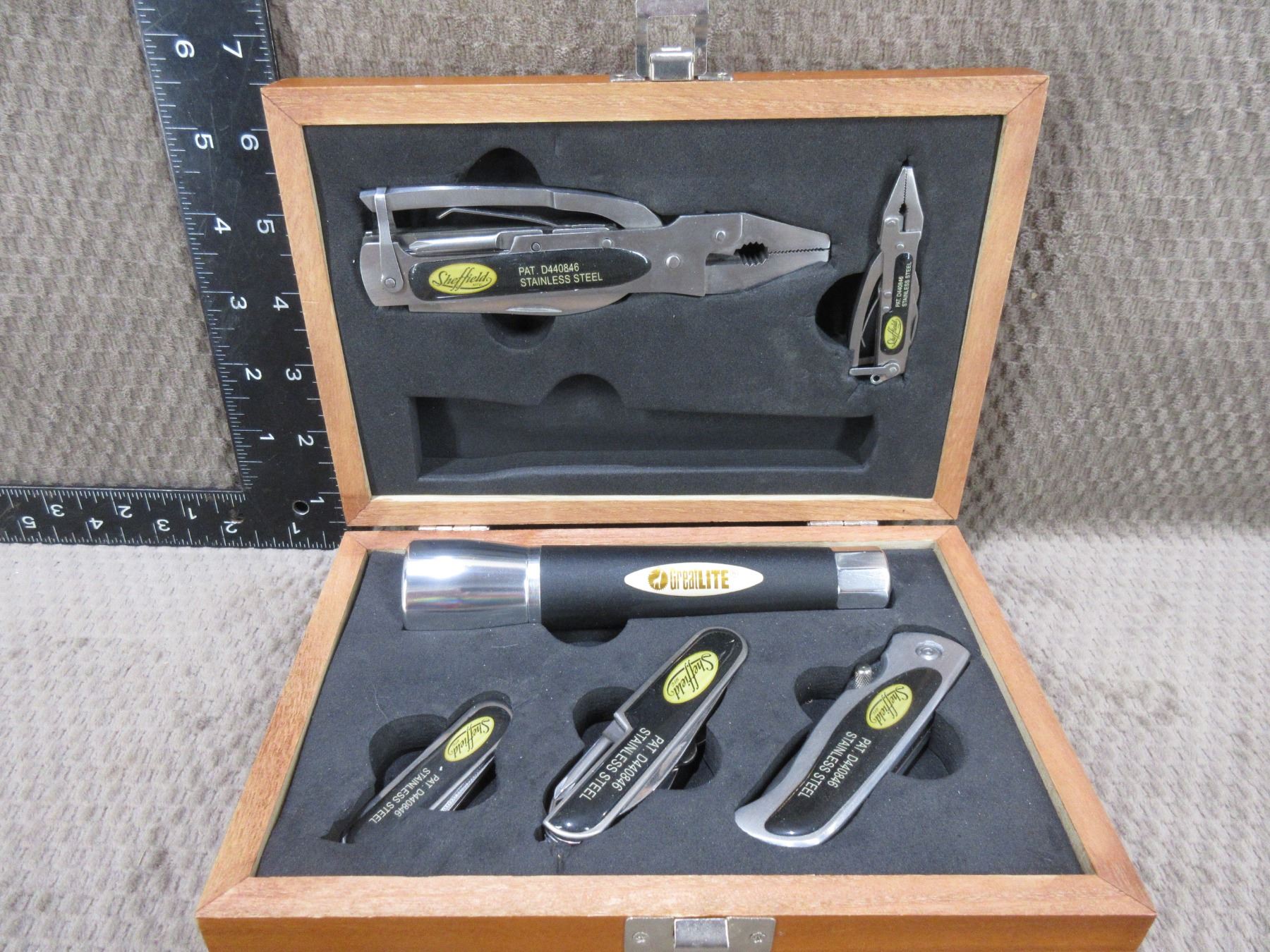 Sheffield MFG. Cherry Case with 3 Knives, 1 Flashlight and 2 Multi-Tools