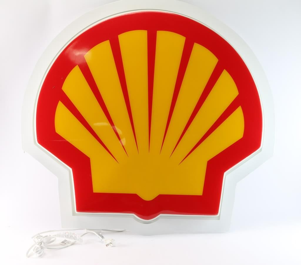 Shell light up gas station sign. Measures: 39"W x 38"H. ***Buyer Must Arrange Shipping***