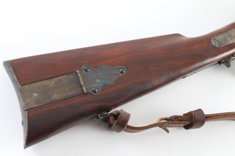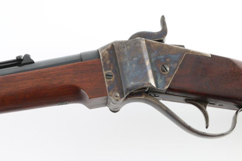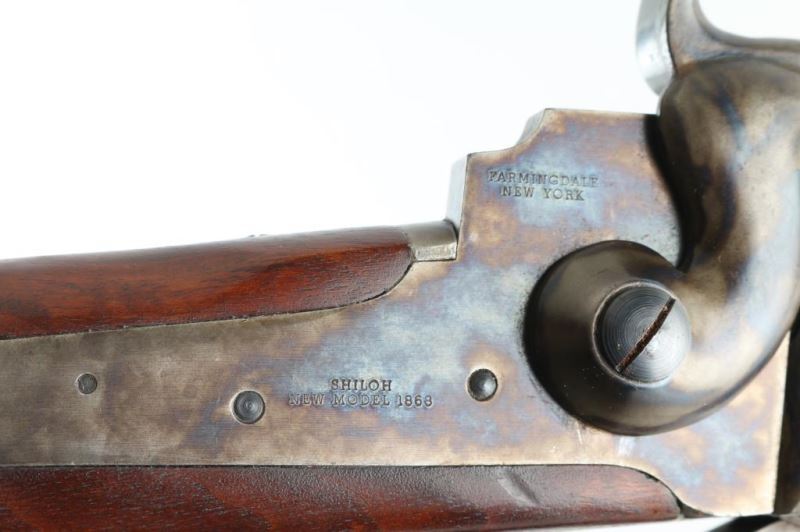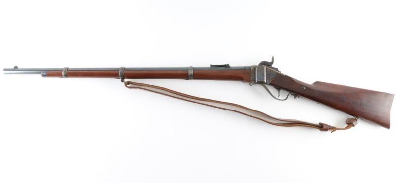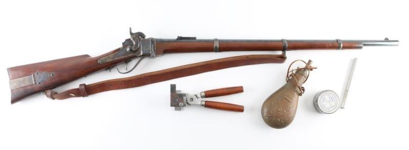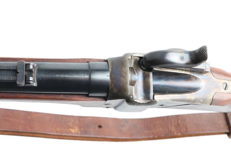 Rifle. Percussion. Single-Shot. Black Powder. Falling block. Sn: 1254 Farmingdale, New York produced. Copy of the Civil War model 1863 3 band rifled musket. Similar in all respects to the Berdan Sharps except the caliber. 30" blued round barrel, with case-hardened components. Front blade, elevation adjustable rear flip sights. Patch box on right side of stock. Bore is excellent/bright. Metal finish is near excellent with a few minor scratches. Walnut stock/forearm are very good with some minor dings/scuffs. Hammer locks up tight. Comes with brown leather sling. Also included is a box of accessories, Copy of Civil War powder flask,bag of ,54 cal. bullets, Bullet mold. Paperwork, tin of Navy Arms caps, and cap applicator. NRA Condition-Excellent. Antique Firearm.
