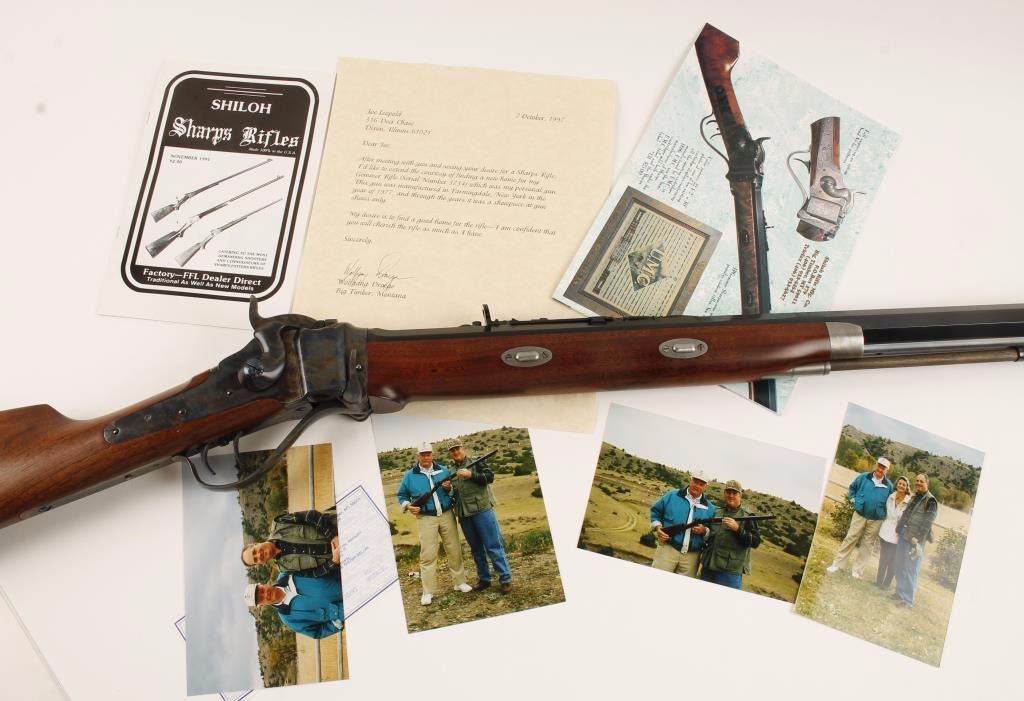 SN: 3734 High quality blued & case hardened single shot falling block sporting rifle chambered in .45-70 Government, circa 1977. Manufactured in Farmingdale, New York and was the personal gun of Mr. Wolfgang Droege founder & CEO of the Shiloh Rifle Manufacturing Company. Mr. Droege used this rifle as a showpiece at gun shows only and wrote a letter to that effect in transferring the firearm to our consignor. Also includes are four pictures of Mr. Droege and our consignor with the rifle, two catalogs and a receipt. Features a heavy 30" blued octagonal barrel, blade front sight, adjustable buckhorn rear sight, case hardened receiver, set triggers, ram rod, pewter furniture, deluxe grade plain forearm and straight grip shoulder stock with cheek rest and case hardened crescent buttplate. Finish is seemingly untouched with the only wear observed is a few small scratches on the hammer screw. Action is smooth, bore is excellent and stock is very fine. A wonderful example of a Shiloh Rifle Mfg. Co. JP Gemmer rifle owned by the man himself. Condition is like new. ***Modern Firearm***