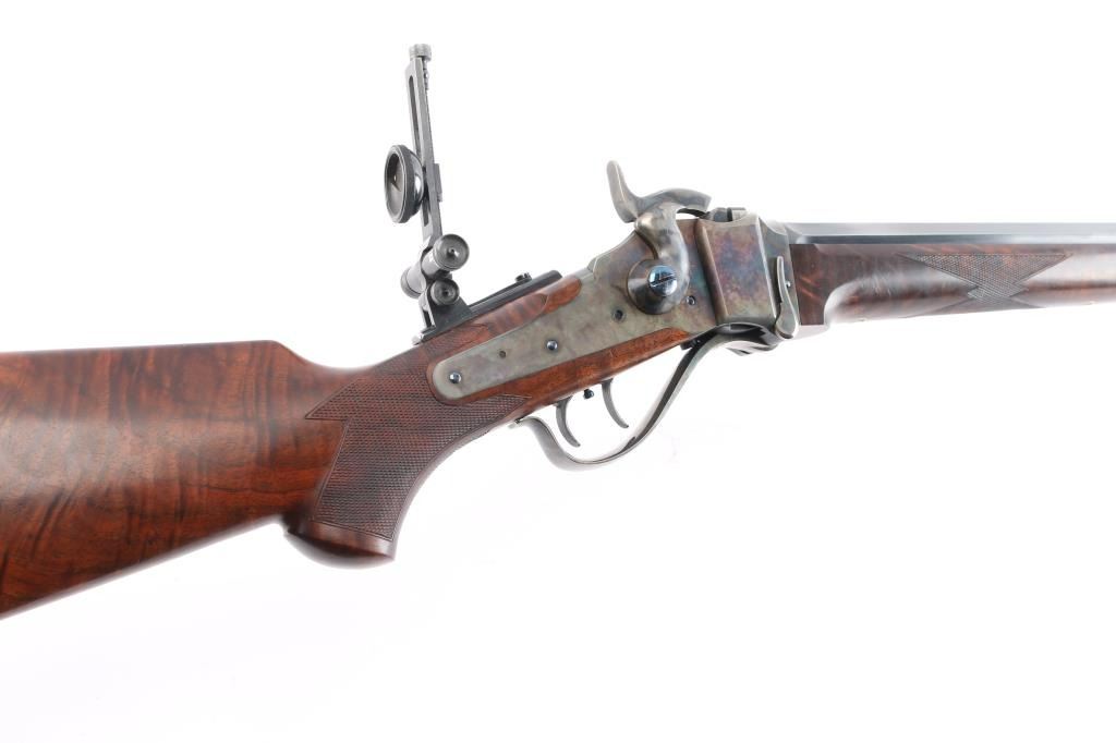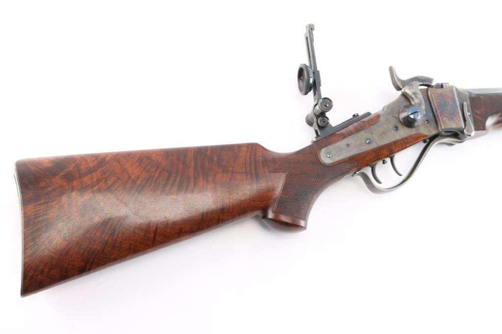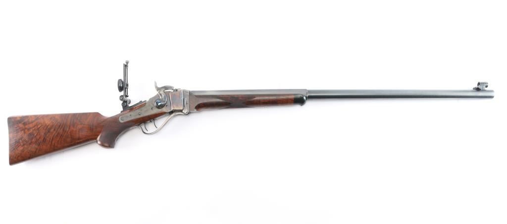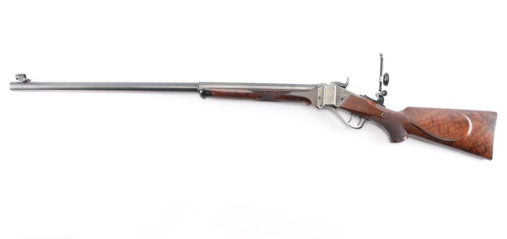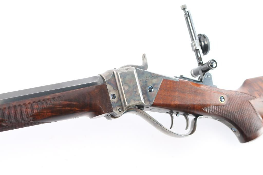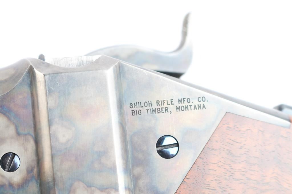 High quality & faithful reproduction of the Sharps Rifle Company Model 1874 falling block single shot sporting rifle chambered in .45 2 1/10".(.45-70) The consigner ordered this rifle with top of the line sights and wood. Manufactured in Big Timber, MT. Features a high polish blue match-grade, half-octagon/half-round 30" barrel with dovetailed globe front sight with post insert and prism, #103 Buffalo Soule fully-adjustable long-range tang sight with variable aperture eye piece. The top of the barrel is marked “Shiloh-Sharps Model 1874” and “CALIBRE 45 / 2 1/10”, the bottom (under the forend) is marked with the serial number and “45 70”. The inside of the forend has “1994B” & "AAA" written in black marker. The left of the receiver is marked “SHILOH RIFLE MFG. CO. / BIG TIMBER, MONTANA”, the top is marked with the serial number behind the loading groove. Case color receiver, hammer, lever and buttplate, fire blue screws. Highly figured presentation grade wood with AAA hand-rubbed finish using multiple coats of tung oil enhancing the wood's depth and luster, ebony fore tip, Niedner checkered steel buttplate, right hand shadow-line cheek rest, fine point checkered panels at wrist . Double set triggers. Bore is pristine, the wood is excellent and the blue and case colors are overall excellent with very minor edge wear to the barrel flats, minor scratches. Manufactured 1983-Present.