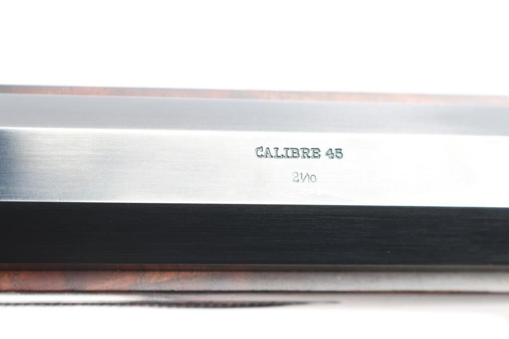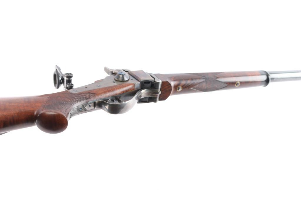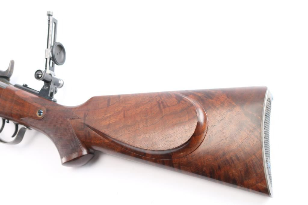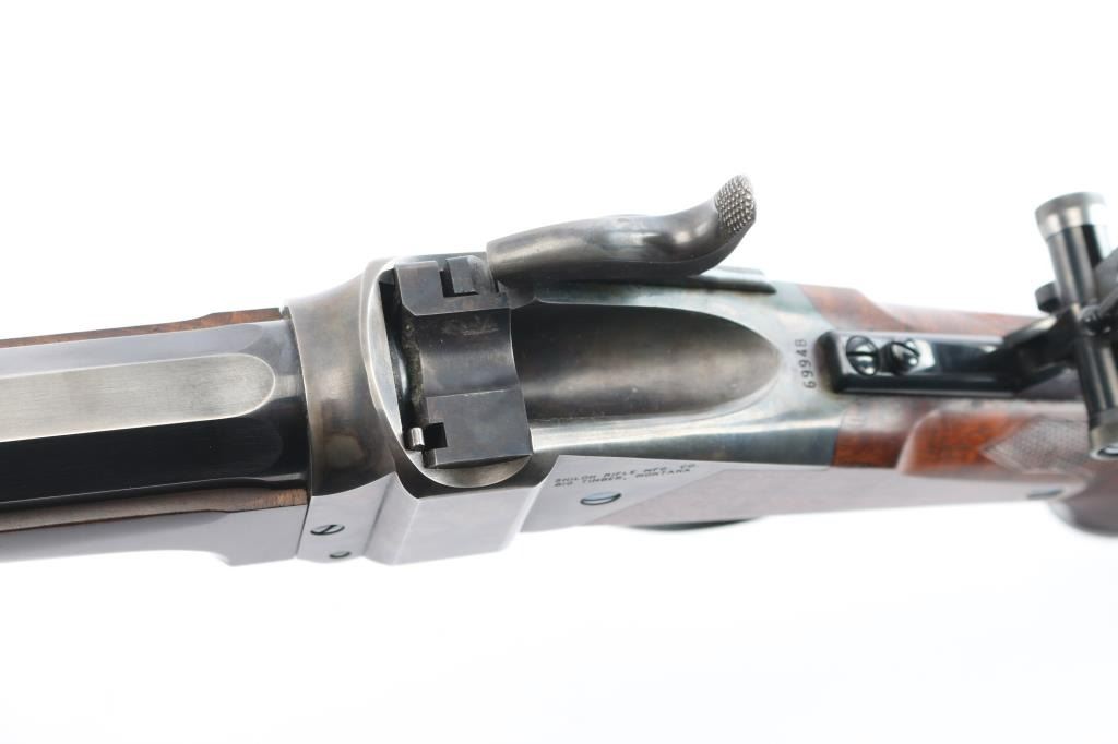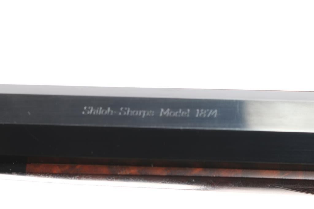High quality & faithful reproduction of the Sharps Rifle Company Model 1874 falling block single shot sporting rifle chambered in .45 2 1/10".(.45-70) The consigner ordered this rifle with top of the line sights and wood. Manufactured in Big Timber, MT. Features a high polish blue match-grade, half-octagon/half-round 30" barrel with dovetailed globe front sight with post insert and prism, #103 Buffalo Soule fully-adjustable long-range tang sight with variable aperture eye piece. The top of the barrel is marked “Shiloh-Sharps Model 1874” and “CALIBRE 45 / 2 1/10”, the bottom (under the forend) is marked with the serial number and “45 70”. The inside of the forend has “1994B” & "AAA" written in black marker. The left of the receiver is marked “SHILOH RIFLE MFG. CO. / BIG TIMBER, MONTANA”, the top is marked with the serial number behind the loading groove. Case color receiver, hammer, lever and buttplate, fire blue screws. Highly figured presentation grade wood with AAA hand-rubbed finish using multiple coats of tung oil enhancing the wood's depth and luster, ebony fore tip, Niedner checkered steel buttplate, right hand shadow-line cheek rest, fine point checkered panels at wrist . Double set triggers. Bore is pristine, the wood is excellent and the blue and case colors are overall excellent with very minor edge wear to the barrel flats, minor scratches. Manufactured 1983-Present.
