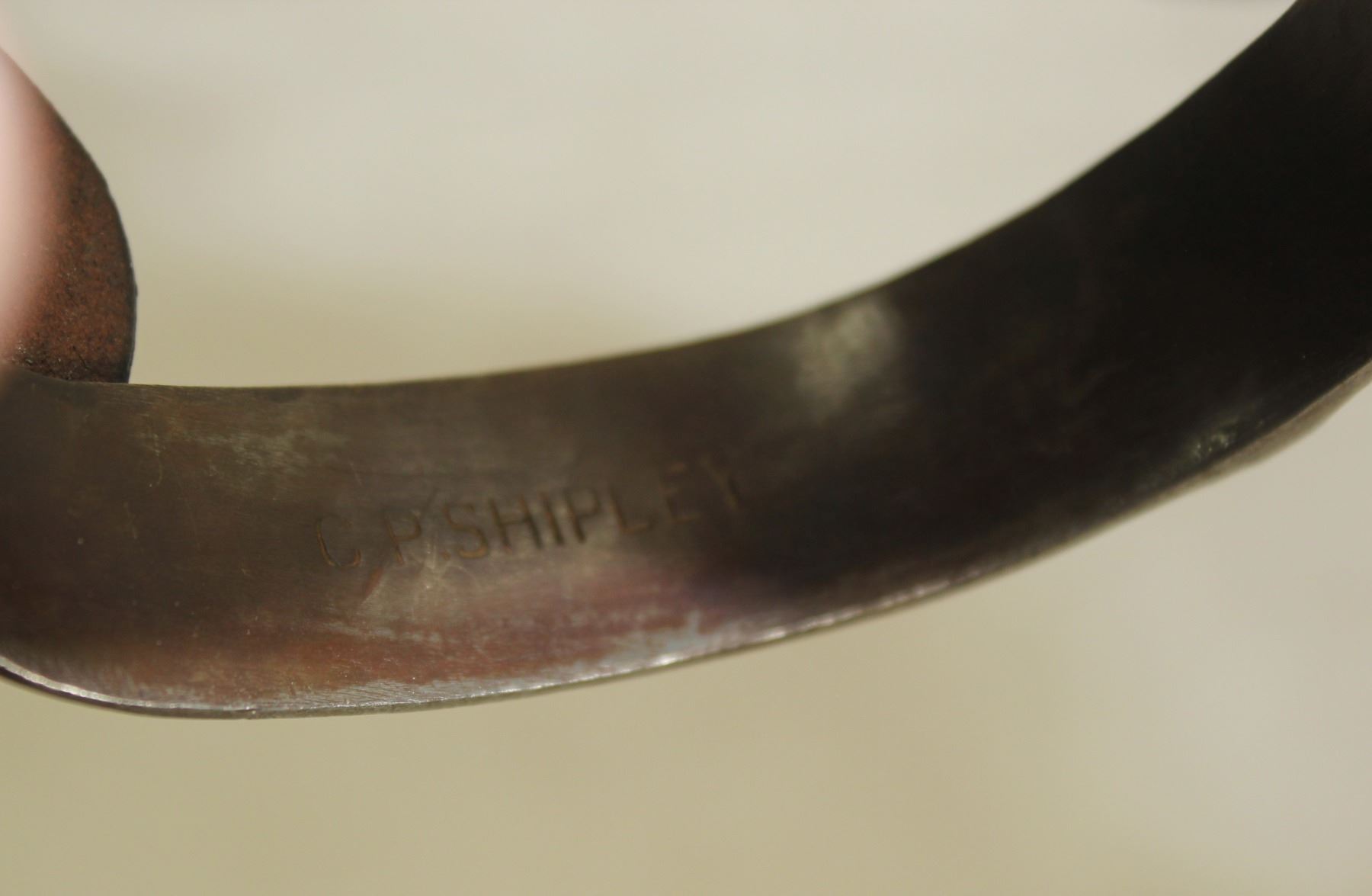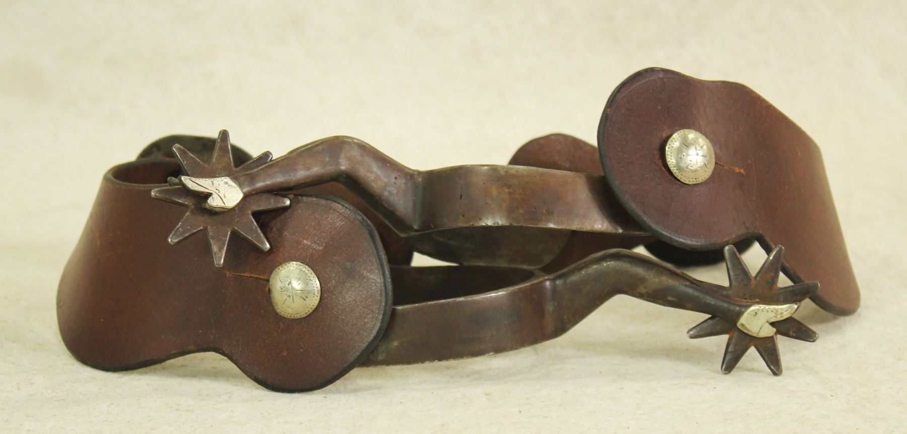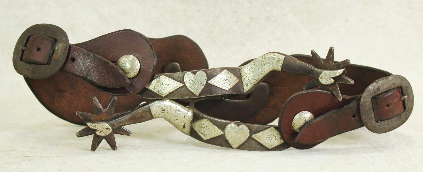A very rare pair of single mounted gal leg spurs with shaped gal leg shanks, finely engraved heart heelbands and nice inside heelband maker marks.