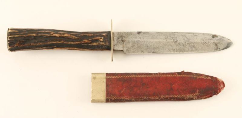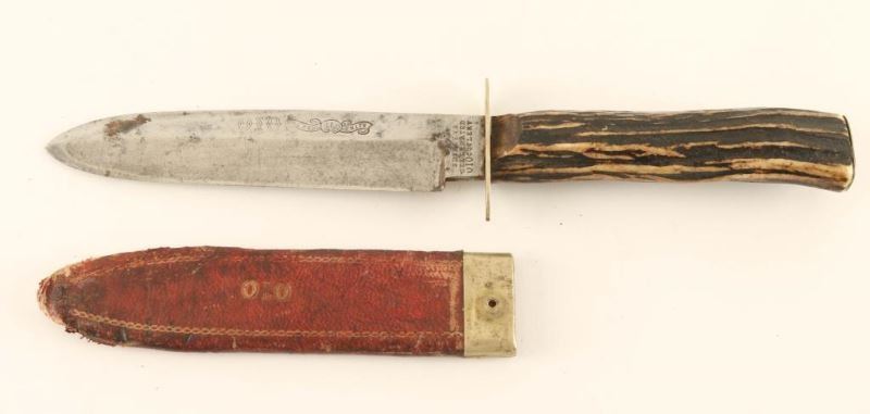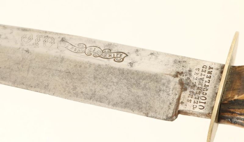 Spear point with correct marked 'OIO' scabbard. Measures 10 1/4" overall with a 5 7/8" blade which has been sharpened and good to very good overall. Scabbard is missing tip and button hanger, otherwise very good.