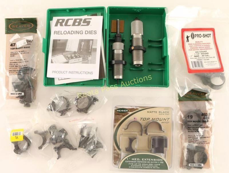 Including; Weaver 1" Med. extension top mount, 2 Weaver Top Mount Bases-19 and 47, RCBS 7-30 Waters Dies, and much more.