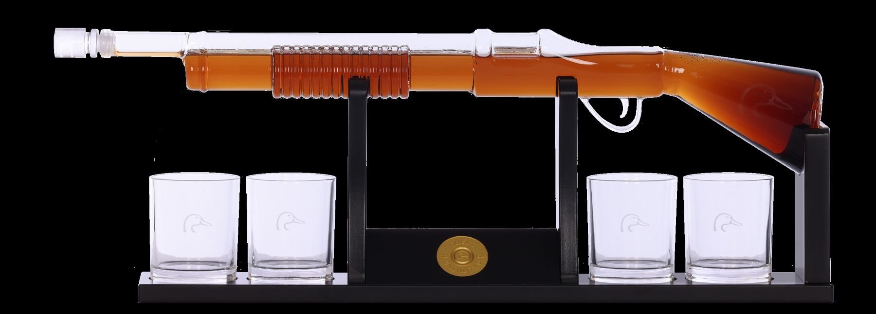 The Shotgun Decanter Set offers a blend of functionality and style, making it a standout addition to any home bar. The centerpiece of the set is the 750ml decanter, featuring the iconic DU duckhead logo etched onto its stock, adding a touch of sophistication. This decanter is elegantly housed on a wooden stand, accentuated with a custom gold shotgun shell medallion, enhancing its visual appeal. Accompanying the decanter are four low ball glasses, each meticulously etched with the duckhead medallion on the front and the shotgun shell design on the bottom, adding a subtle yet distinctive touch to every sip. With its combination of craftsmanship and design, this shotgun decanter set promises to elevate any drinking experience with style and flair.