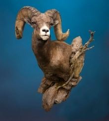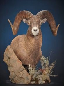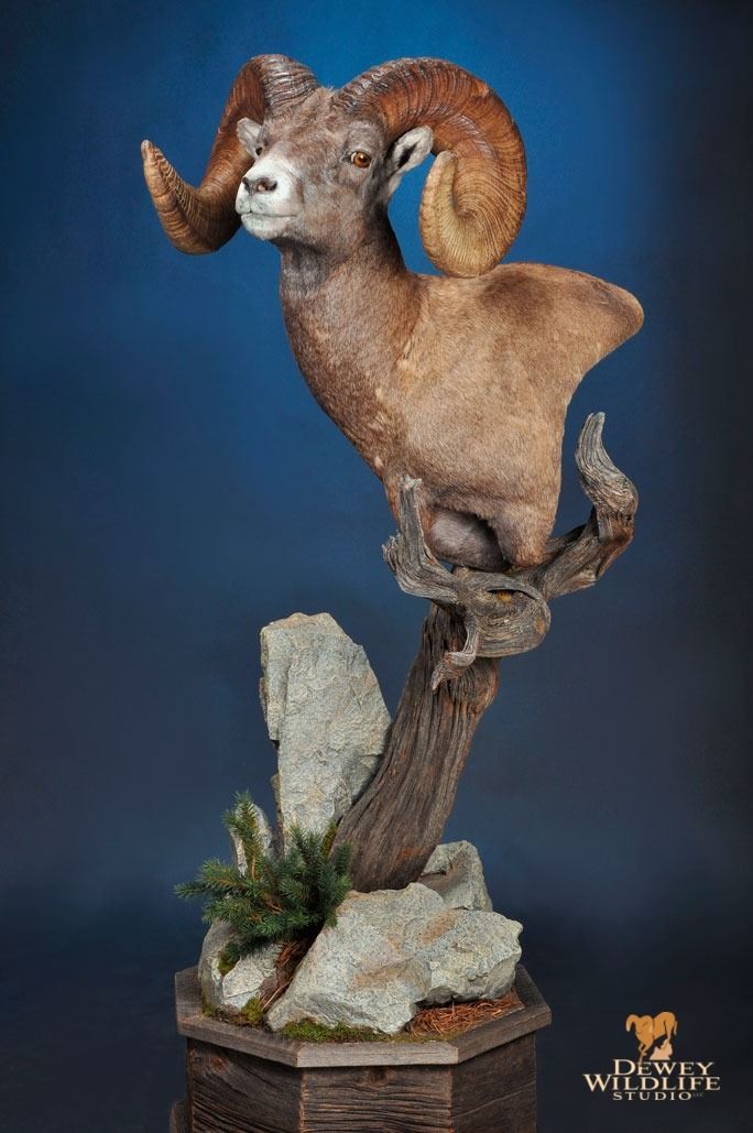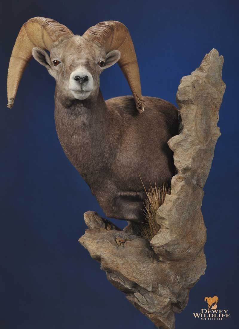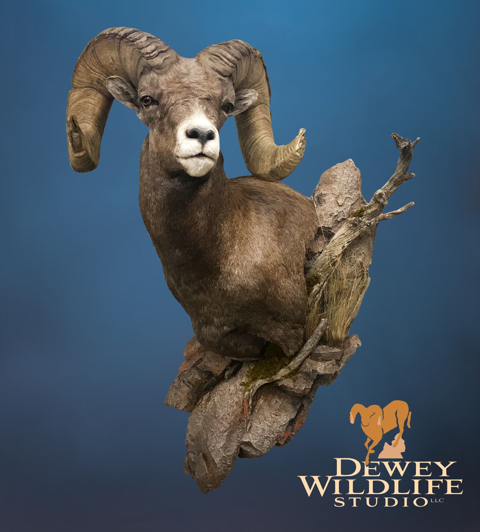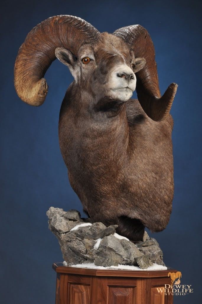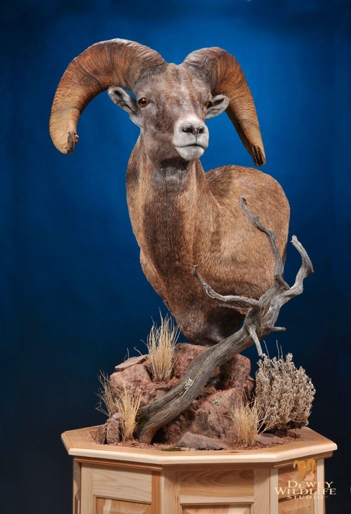 Description: A Sheep Shoulder Mount on Pedestal with Habitat. The Dewey Wildlife Studio Team is honored to serve the most discerning clients and be recognized as one of the finest custom taxidermy studios in the world.