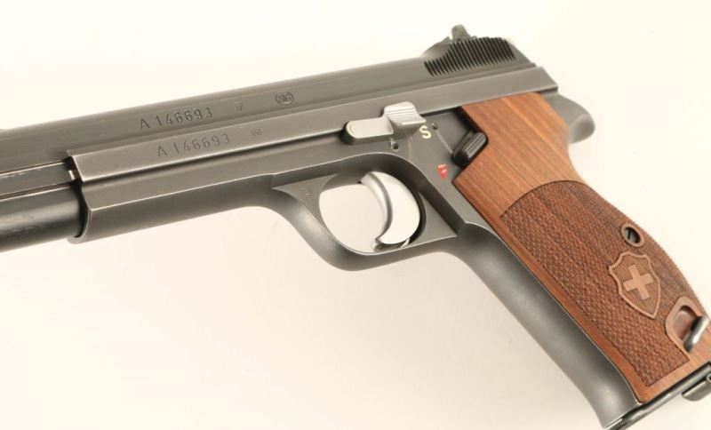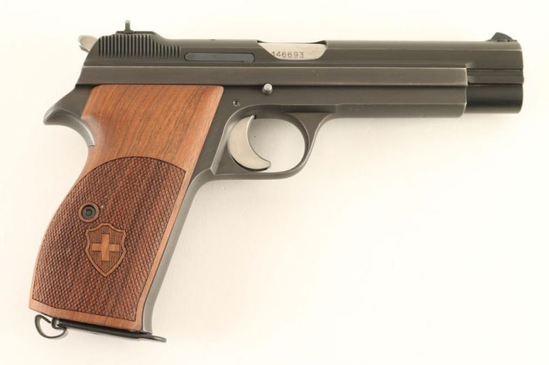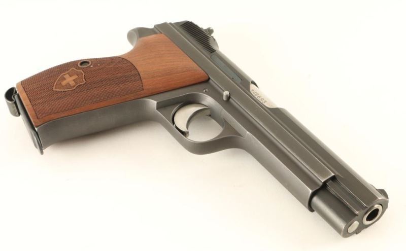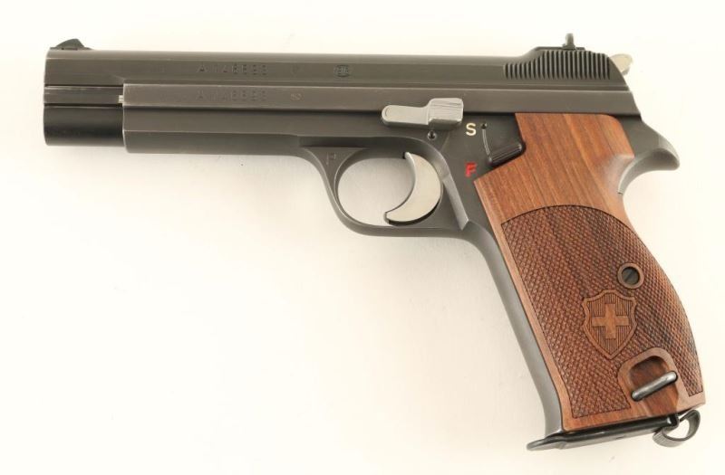 'P49 or P210-2' Swiss military single action semi-automatic service pistol chambered in 9x19mm. Produced in Switzerland by Schweizerische Industrie Gesellschaft(SIG) and renowned for their durability & accuracy. Features a low luster blued slide, 4.8" barrel, dovetailed fixed sights, smooth two-stage trigger, serrated hammer spur, thumb safety, heel magazine release, 8 round magazine, phosphorous finished steel frame with lanyard loop and one-piece Nill-Griffe finely checkered walnut wrap-around grip w/ Swiss shield decor. Includes a spare magazine, the original black plastic grip and a reprinted manual. All visible serial numbers are matching and no import marks have been observed. Standard markings with a "P" stamped on the trigger guard indicating it's release to a service member. Pistol exhibits approximately 97% of it's original finish showing minimal edge wear, few light handling marks/scuffs and slide wear on the frame from the safety & slide release levers. Action is smooth, bore is pristine and wood grips are fine. Condition is NRA excellent. ***C& R Firearm***
