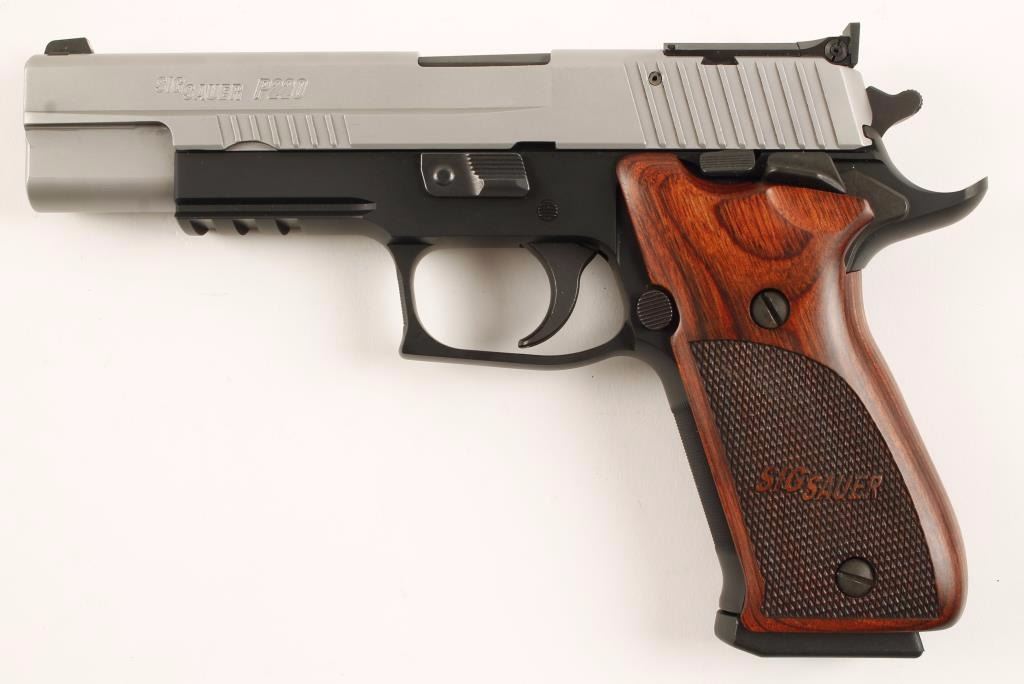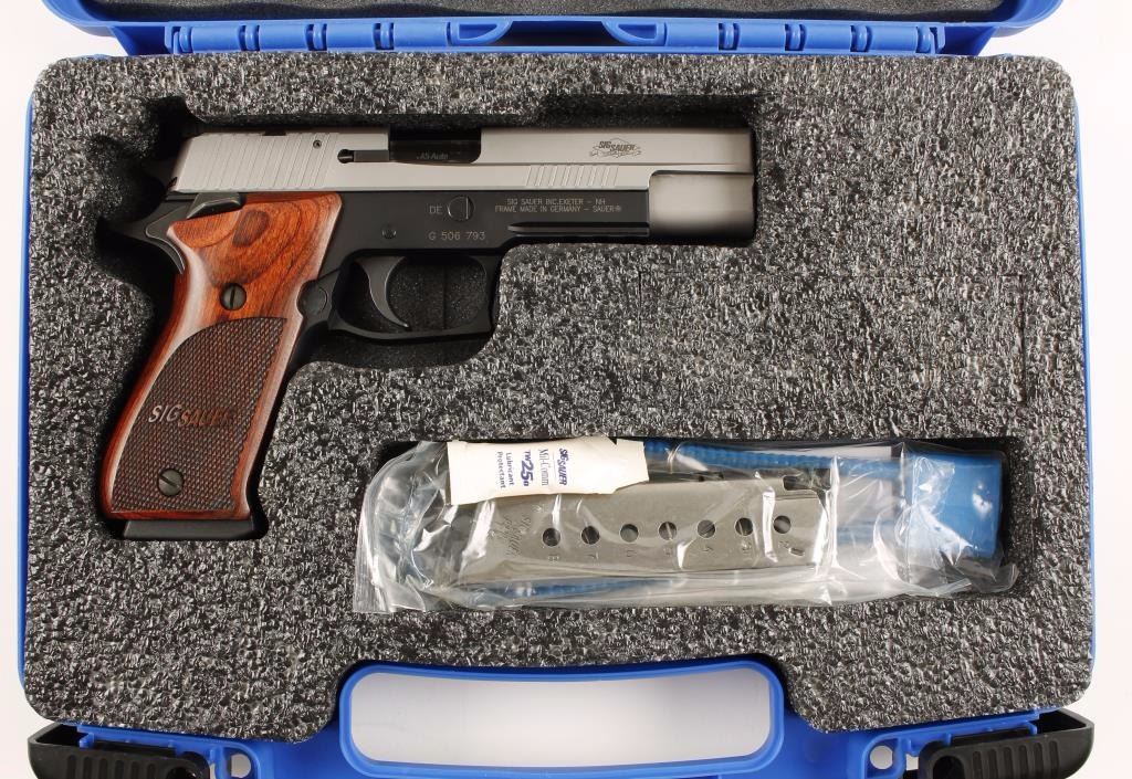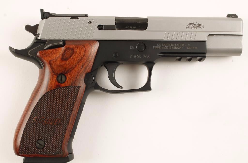 Two tone full size double action semi-automatic pistol chambered in .45 Automatic. Features a 5" barrel, matte finished stainless steel partially serrated slide, Siglite front sight, adjustable rear sight, black Nitron finished beavertail frame with integral accessory rail, checkered grip strap, push button magazine release, 8 round magazine, ambidextrous safety switch, smooth trigger and Sig Sauer custom checkered laminated wood grips. Includes the original factory box, extra magazine, lock and documents. Finish shows no sighs of use or wear. Action is strong, bore is mint and grips are fine. Condition is like new in box. ***Modern Firearm***