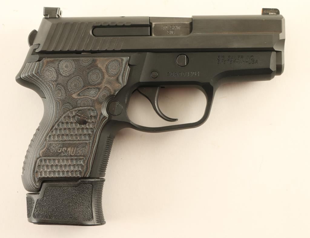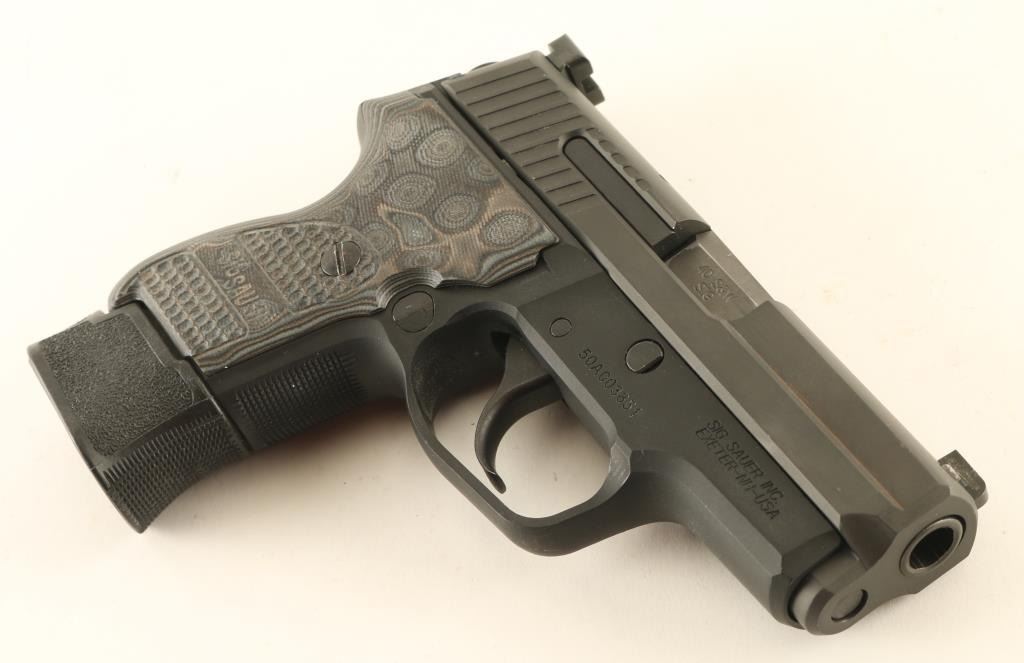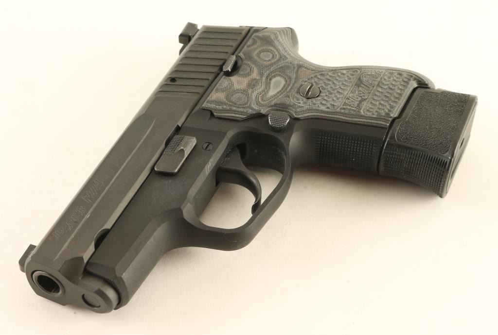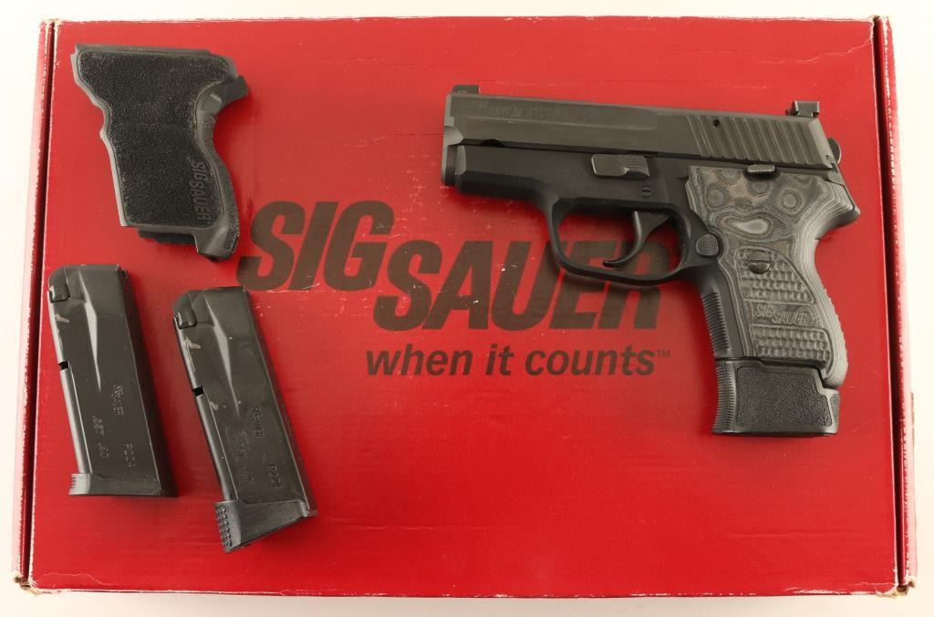 Semiautomatic pistol features matte dark gray metal finish, gray laminated G10 grip, 3.5" barrel, 3 dot night sights in dovetails, double action only trigger with restrike. Bore is excellent. Retains 90% finish with bare metal showing on sharp edges, high spots, where parts rub during operation. Grips are excellent. Includes (1) extended magazine, (1) flush fit magazine, (1) finger rest magazine, manual, original polymer grip, spare recoil spring (new in wrap), factory box. Condition is NRA Very Good ++ *** Modern Firearm ***