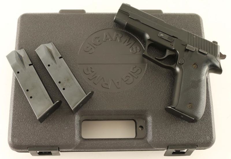 High quality double action semi automatic pistol. Matte black Nitron finished stainless steel slide, 4.4" barrel, dove tailed 3 dot night sights, black anodized alloy frame, a thumb decocker, smooth trigger, serrated round hammer spur, push button magazine release, factory 12 round magazine, and 2 piece Hogue pebbled black rubber grips. Includes a factory hard case with 2 spare magazines. Pistol exhibits approximately 90% of it's original finish showing slide wear on the barrel, light holster wear and a couple bright scuffs. Action is smooth, bore is excellent and rubber grips are good. Condition is very good. ***Modern Firearm***