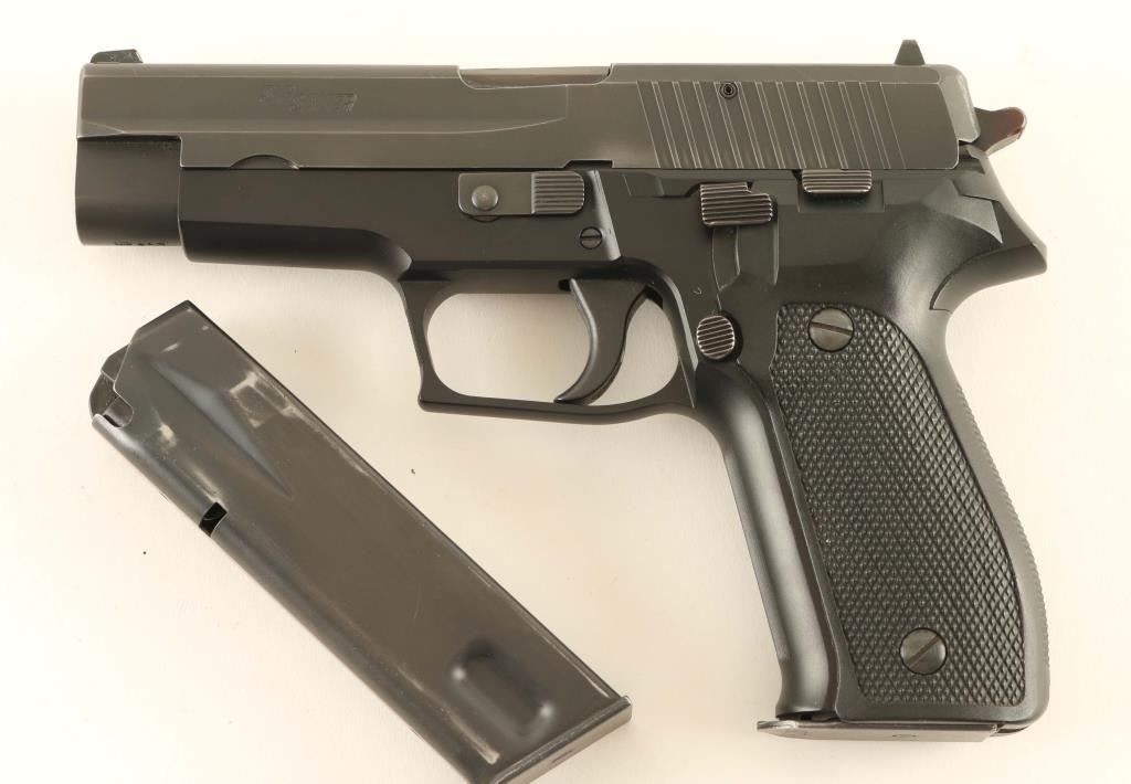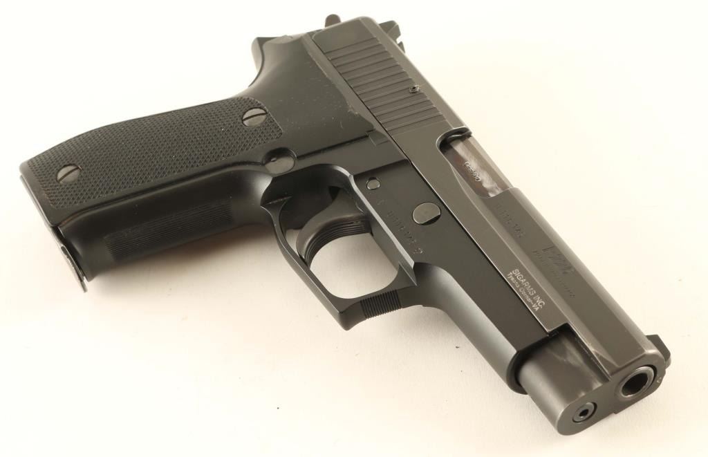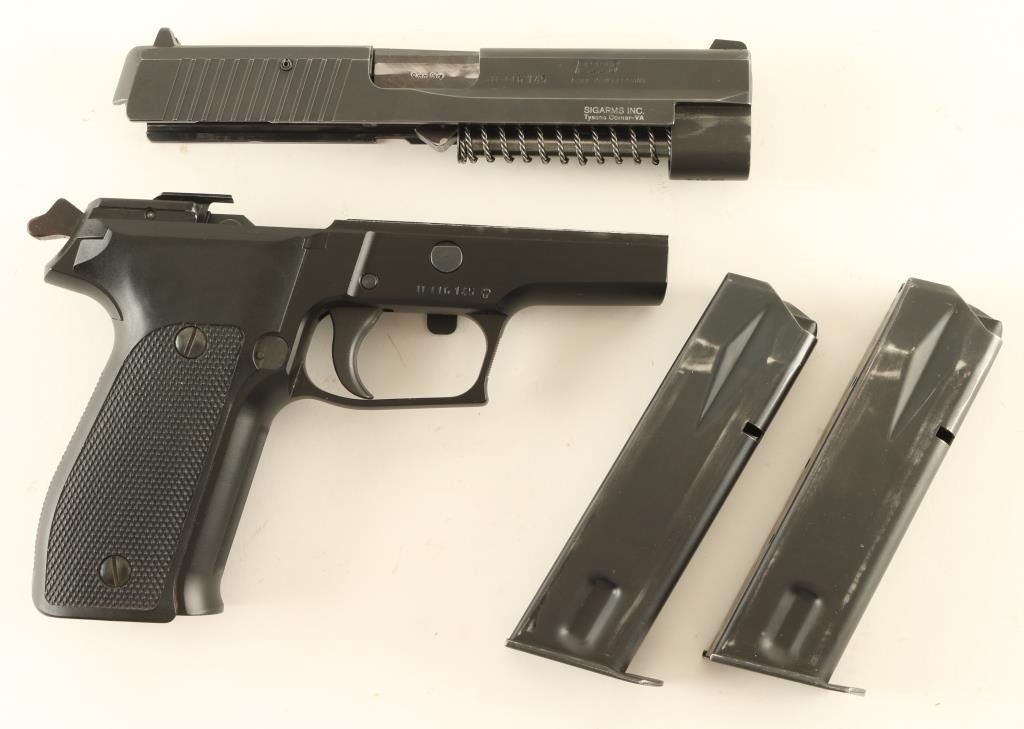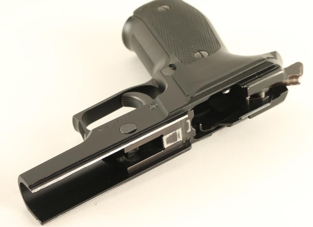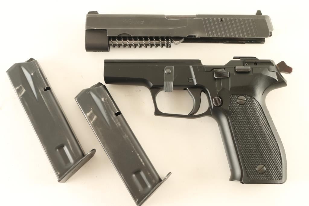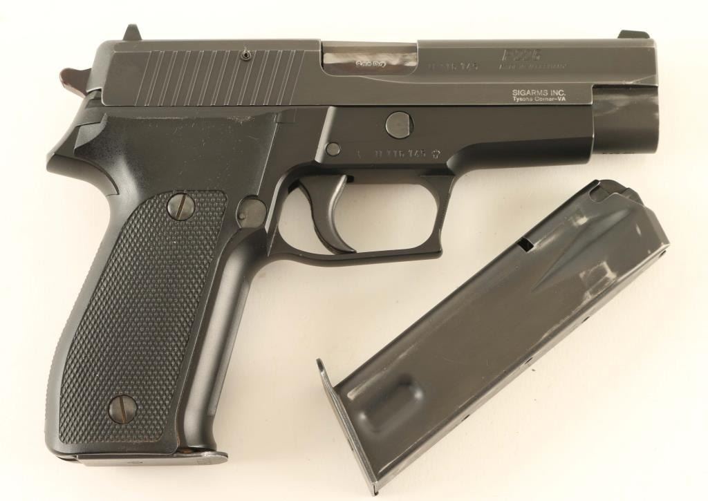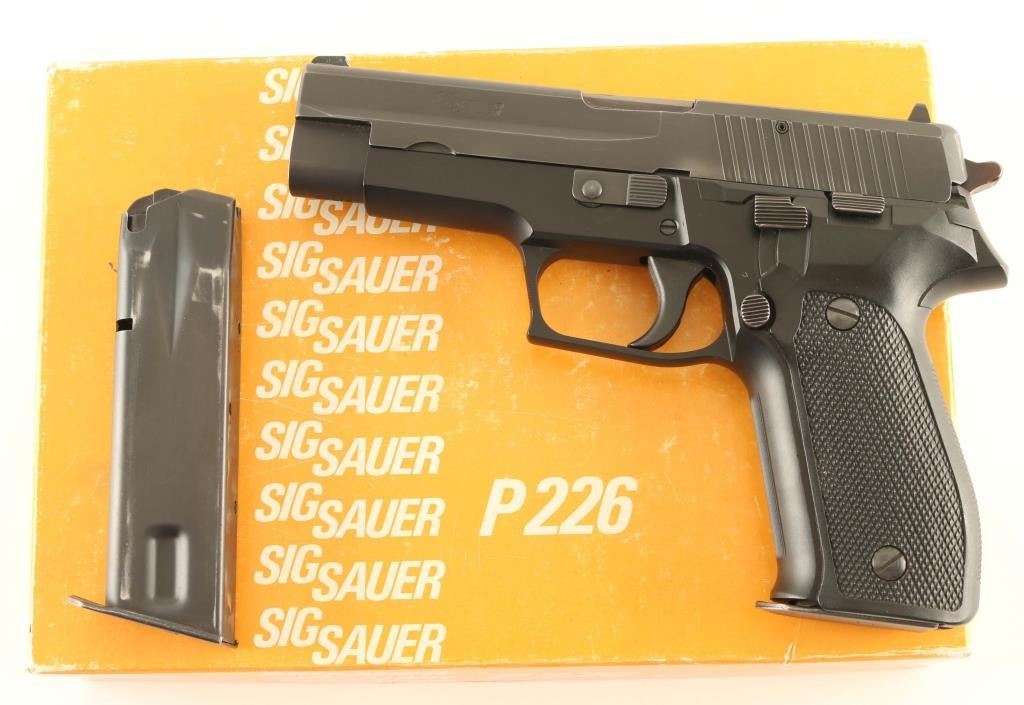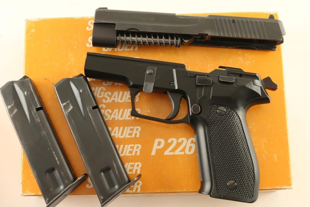 *For Parts or Repair* Quality double action semi-automatic pistol chambered in 9x19mm, manufactured in West Germany circa 1984. Imported by Sigarms Inc. of Tysons Corner, V.A. with import marks on the right side of the slide. Features a matte black finished slide, 4.4" barrel, dovetailed white dot front sight with additional white paint added, dovetailed square notched rear sight with white bar, serrated trigger, serrated round hammer spur, decocking lever on the left side of the frame, push button magazine release, factory 15 round ‘dovetailed’ magazine with “P226” stamped on the floorplate, black anodized alloy frame with serrated front strap , and two-piece checkered black synthetic grips with integral lanyard loop. Includes the original two-piece orange cardboard factory box with fitted foam interior containing a manual, test target and spare magazine. Pistol retains approximately 90% of its original finish showing slide wear on the barrel, light holster wear and a couple bright scuffs. The top edge of the rail on the right side of the frame is broken off - missing. The bore appears excellent but is dirty and the synthetic grips are very good. ****For parts or for factory repair only.**** Condition is NRA Poor ***Modern Firearm***