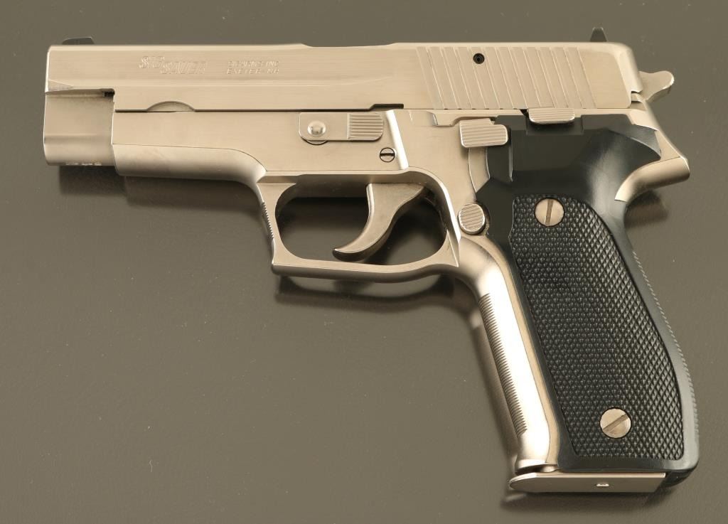 German semiautomatic pistol imported by SigArms, Exeter NH. Features electroless nickel finish, checkered black plastic grips, 4-3/8" barrel, dovetail mounted sights, pushbutton magazine release, decocking lever. Bore is very good condition. Blued barrel shows loss of finish on barrel hood, now mostly bare metal. Nickel finish is in excellent condition with few signs of handling and use. Grips are very good. Includes one magazine. Condition is NRA Very Good *** Modern Firearm ***