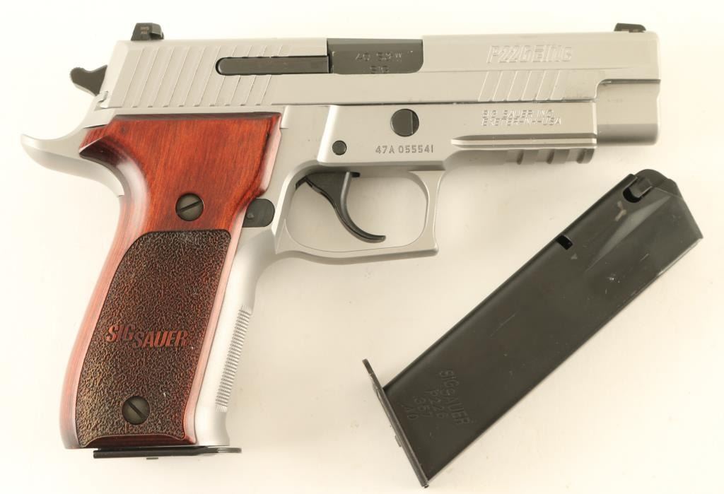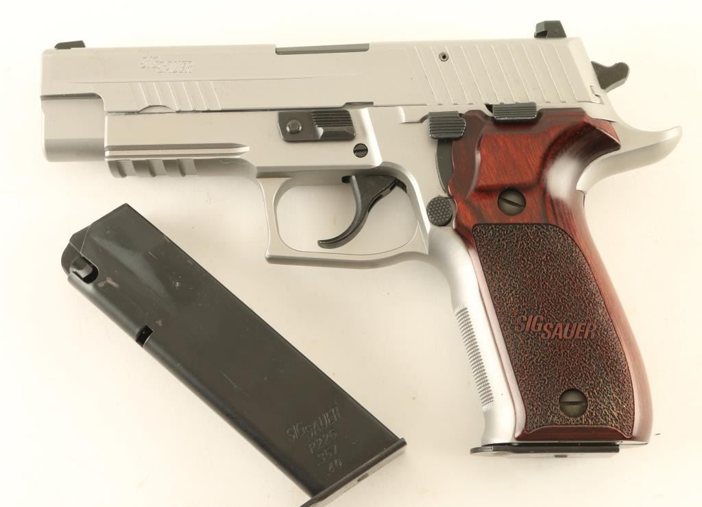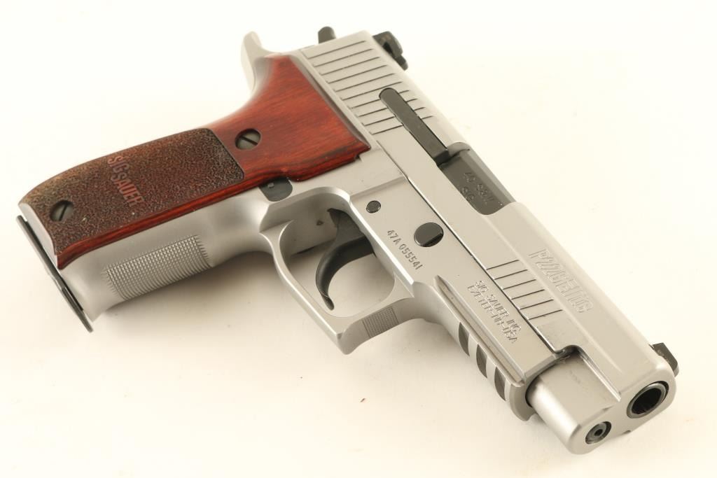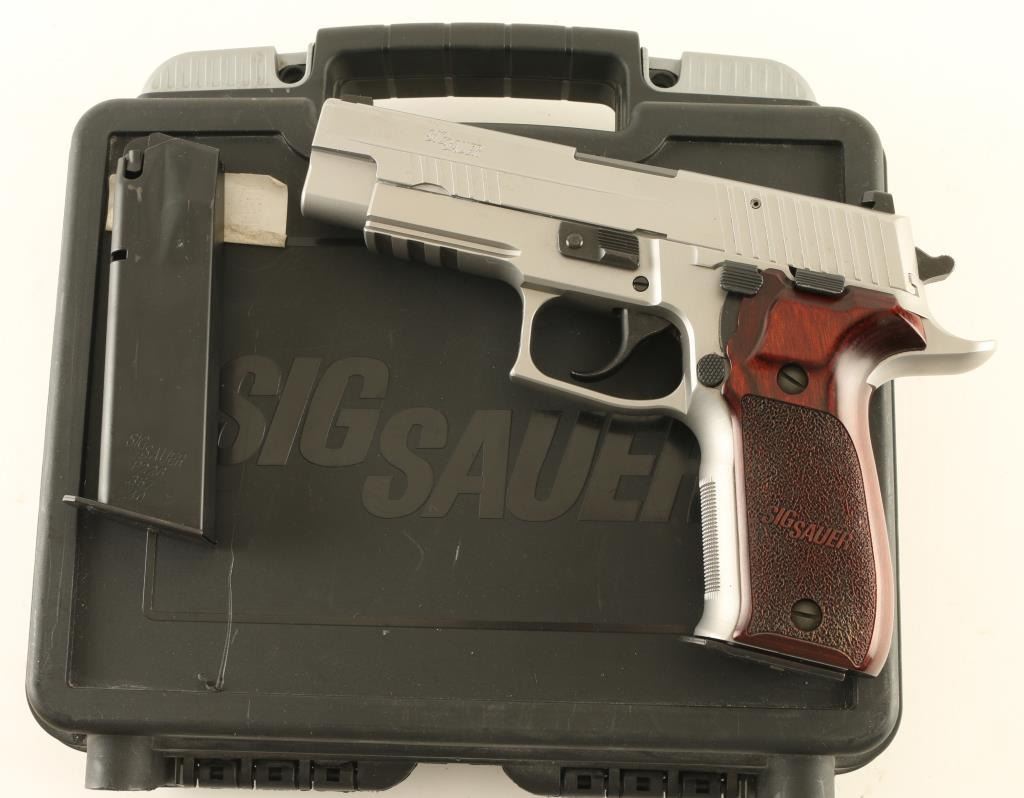 Semiautomatic pistol features silver finish (appears to be hard chrome), 4.25" barrel, three dot night sights in dovetails, accessory rail in dust cover, frame mounted decocking lever, double/single action, pushbutton magazine release, stippled wood grips embossed with "SIG SAUER". Overall condition is like new with few signs of handling. Includes factory hard case, manual, spare magazine (2 total). Condition is NRA Excellent - Like New *** Modern Firearm ***