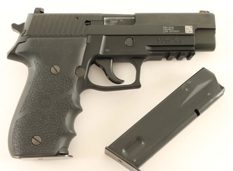 High quality American made double action semi-automatic pistol chambered in 9x19mm. The MK25 is the official sidearm of the United States Navy SEALs. Features a matte black Nitron finished stainless steel slide, 4.4" barrel, dovetailed three-dot night sights, black hard coat anodized alloy frame with integral accessory rail, thumb decocker, smooth trigger, serrated round hammer spur, push button magazine release, factory 15 round magazine, corrosion resistant finished internals, and one-piece Hogue pebbled black rubber wrap-around finger groove grip. Includes the original factory hard case with manual, lock and a spare 'zipper-back' magazine. Pistol exhibits most of it's original finish showing slide wear on the barrel with little wear observed elsewhere. The front sight has been painted with an orange dot, and the slide shows some splattered orange & black paint around the front sight. Action is smooth, bore is pristine and rubber grips are fine. Condition is NRA very good+++. ***Modern Firearm***