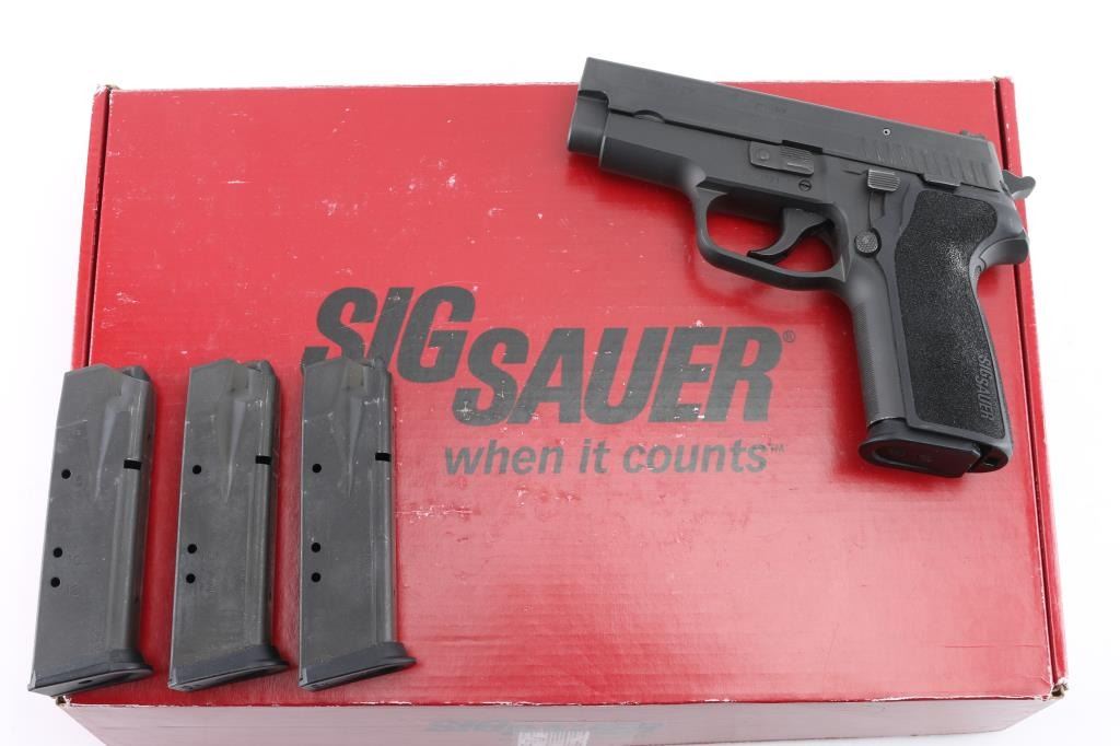Semiautomatic pistol, frame made in Germany, imported by SIGARMS, Exeter NH. Features matte black finish, stippled black plastic grips, 3.8" barrel, dovetail mounted sights, 3 dot red fiber optics, frame mounted decocker, double/single action trigger. 12 round magazine. Bore is pristine. Metal finish looks great. Gun basically looks new. Comes in the original factory box, with lock, manual, & 3 spare factory 12 rd magazines. (4) Total. NRA Condition-Excellent. Modern Firearm.