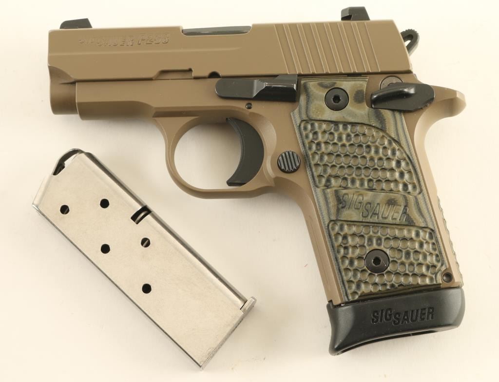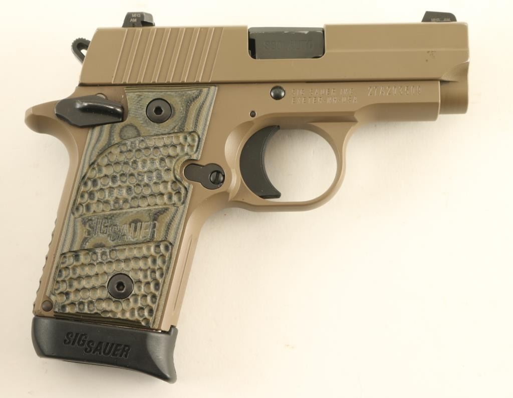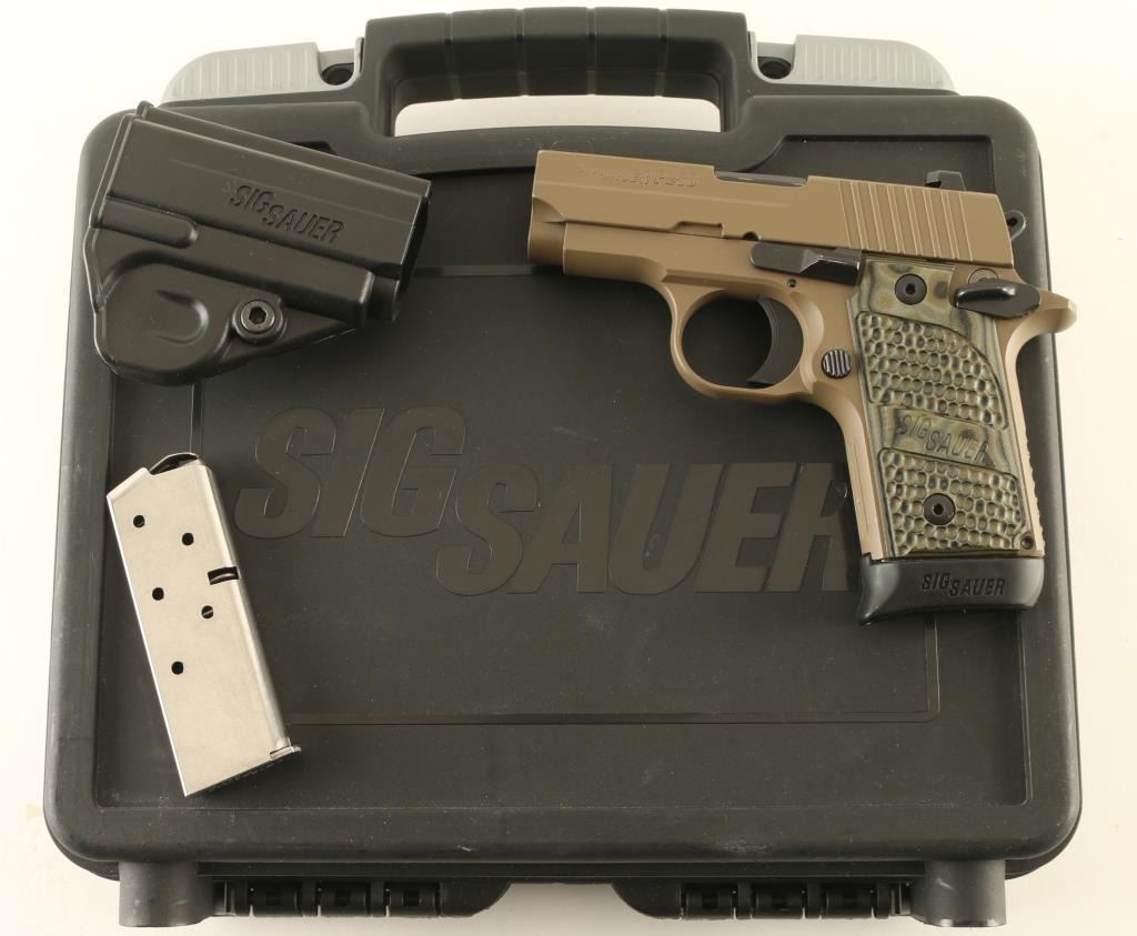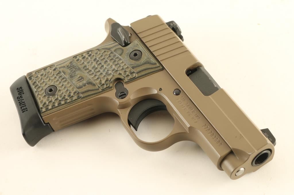 'Scorpion' version semiautomatic pistol features flat dark earth colored finish, textured green camo G10 grips & matching backstrap panel, 2.75" barrel, fixed three dot night sights in dovetails, single action trigger, ambidextrous frame mounted manual safety. Bore is excellent. Retains 95% surface finish with spots of bare metal on sharp edges around slide, on barrel hood. Grips are excellent. Night sights retain a strong glow. Includes (1) flush fit and (1) extended magazine, manual, kydex belt holster, fitted SIG hard case. Condition is NRA Excellent *** Modern Firearm ***