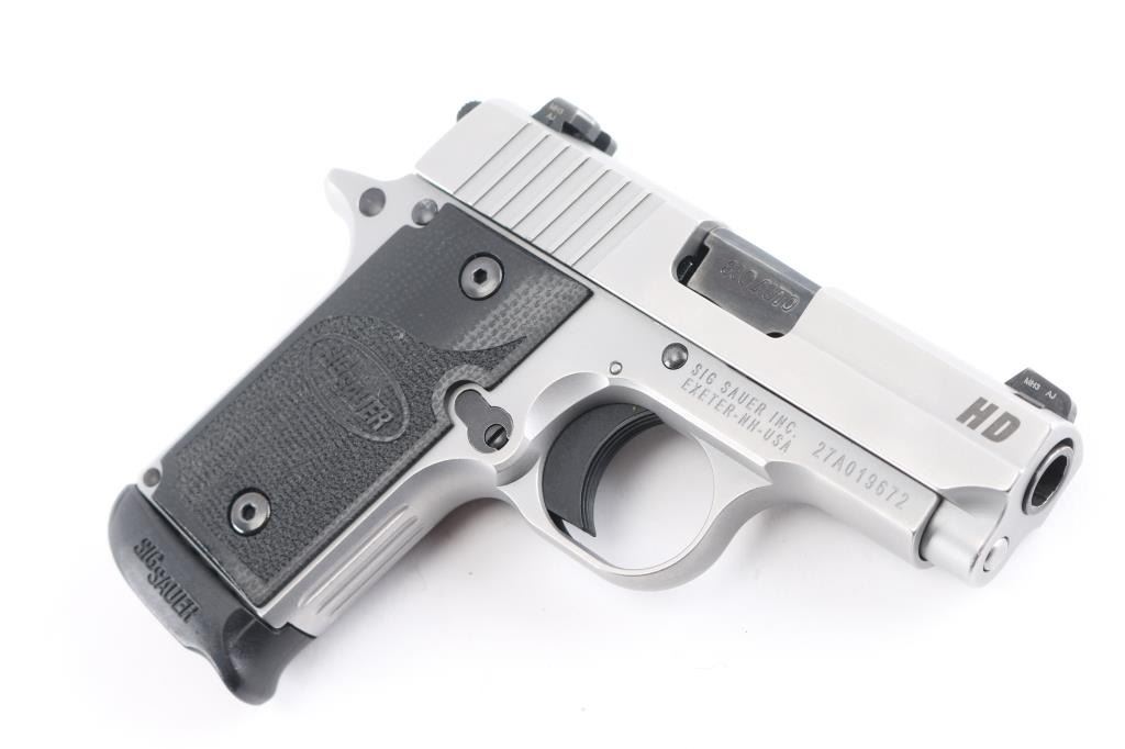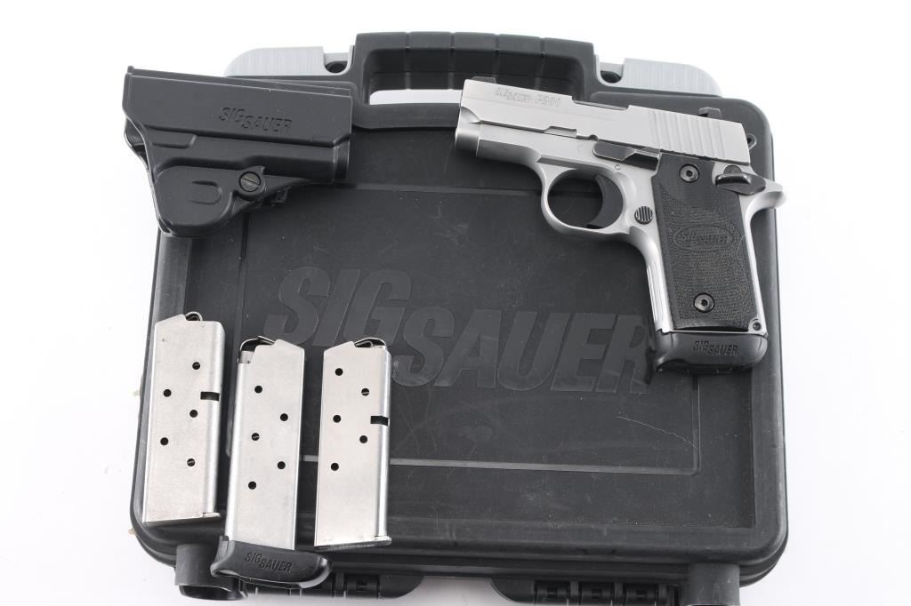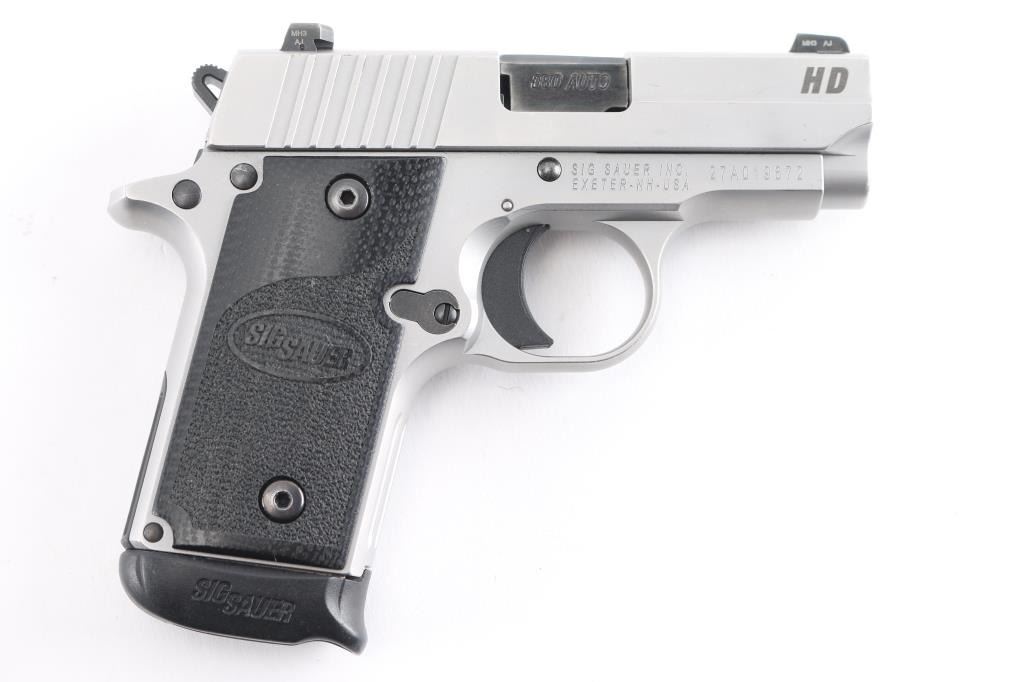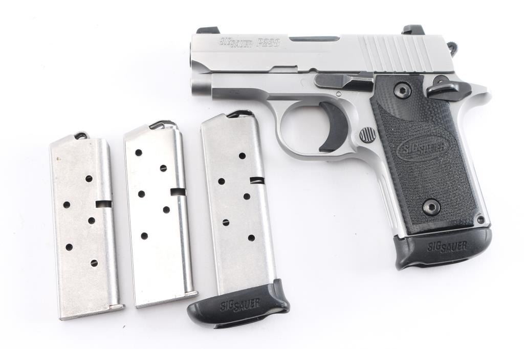 American made pistol, single action, 1911-inspired, micro-compact, semi-automatic, approximately 2 1/2" barrel, three dot night sights, matte stainless steel slide and alloy frame, manual thumb safety, serrated hammer spur, serrated and curved trigger, textured polymer factory grips. Factory magazine with finger rest. metal finish is perfect, grips are fine, bore is excellent/bright. Includes the original box, 2 extra six-round steel factory magazines, one with finger extension, one flush, (3) total. factory black polymer holster and manual.Condition is NRA Excellent. Modern Firearm