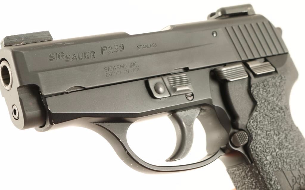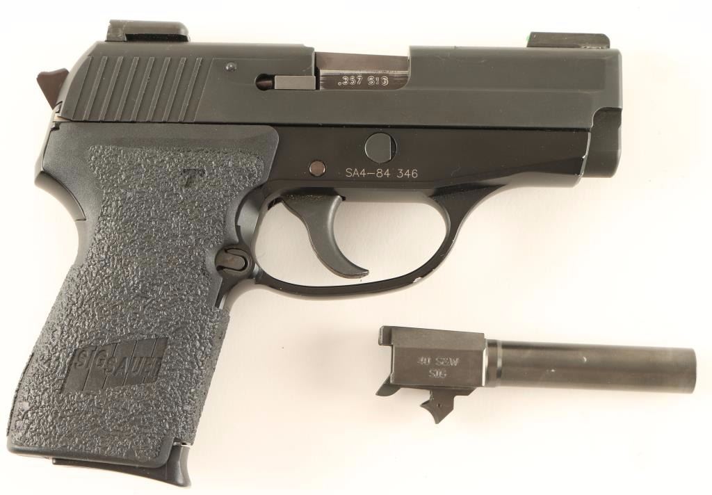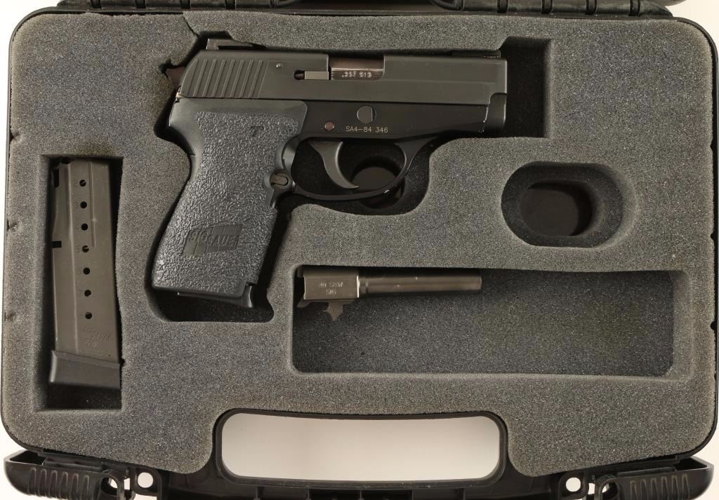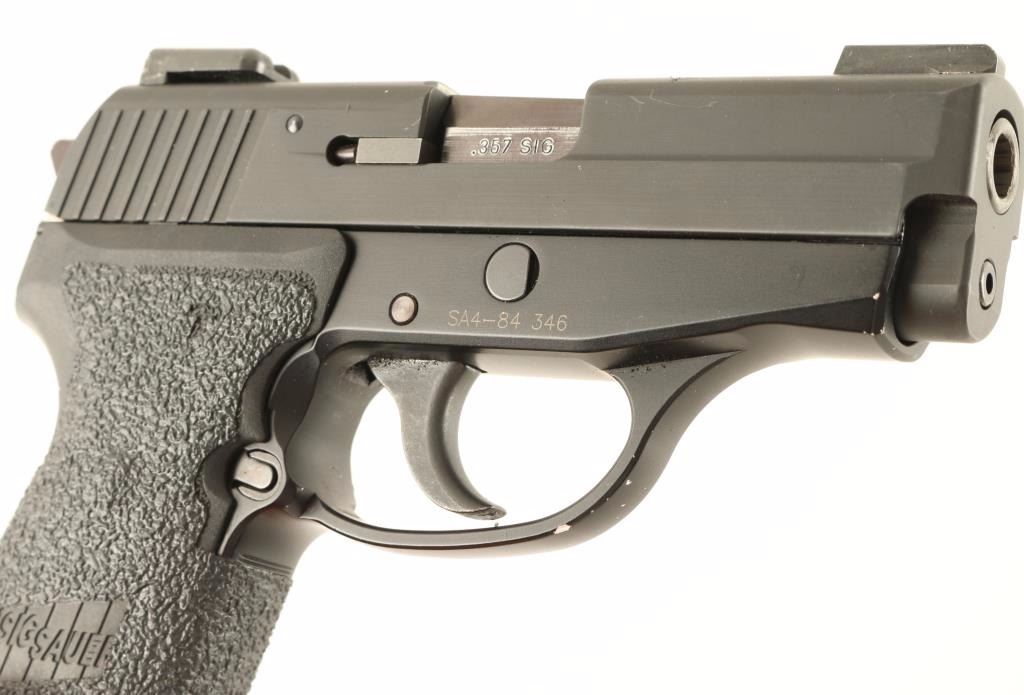 Compact double-action semi automatic pistol chambered in .357 Sig. Features a black hard anodized stainless steel slide, 3.6" barrel, dovetailed TG-H3 night sights, black Nitron finished frame, thumb decocker, smooth trigger, serrated hammer spur, push button magazine release, 7 round magazine, and two piece Sig textured black hard rubber grips with grip tape. Includes the original factory hard case with extra 8 round magazine and a .40 S&W conversion barrel. Pistol shows wear on barrel, light handling marks on the slide and a few small losses on the frame. Action is smooth, bore is pristine and grips are fine. Condition is very good. ***Modern Firearm***