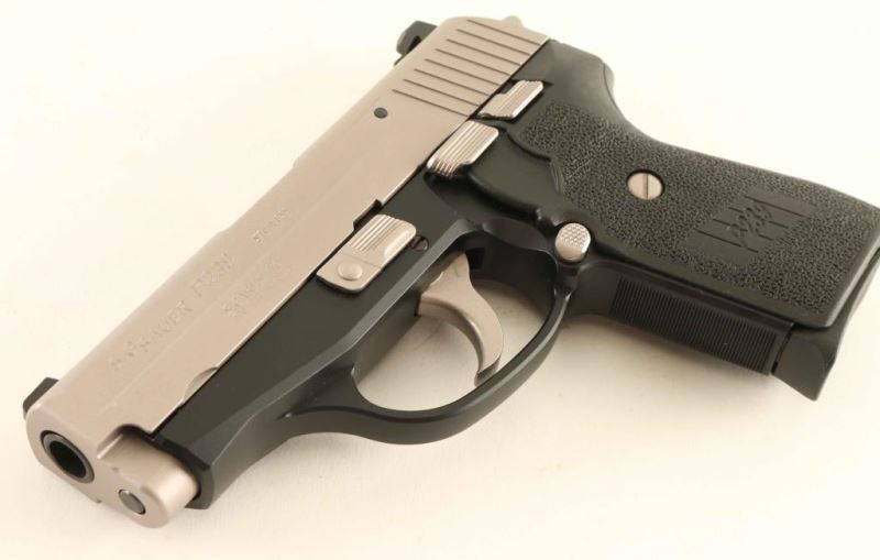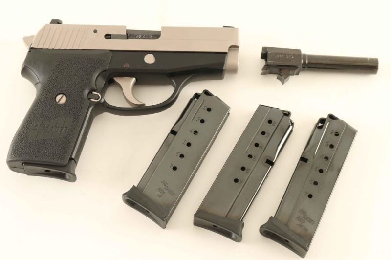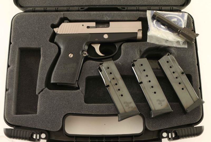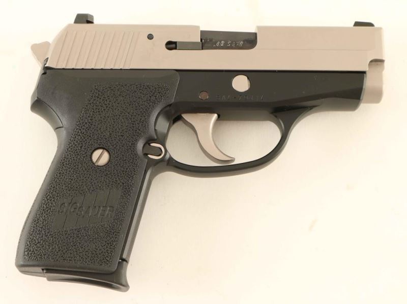 American made double action semi-automatic compact pistol chambered in .40 Smith & Wesson. Features a matte finished stainless steel slide, 3.6" barrel, dovetailed three-dot night sights, smooth trigger, serrated round hammer spur, thumb decocking lever, push button magazine release, factory 7 round magazine with finger rest floorplate, black hard anodized alloy frame with serrated front strap, and two-piece textured black synthetic wrap-around grips. Includes the original factory hard case with manual, lock, .357 Sig conversion barrel and three spare magazines. Pistol exhibits approximately 98% of it's original finish showing only minor slide wear on the barrel which has been covered up by black marker. Action is smooth, bore is pristine and grips are fine. Condition is NRA Excellent in case. ***Modern Firearm***