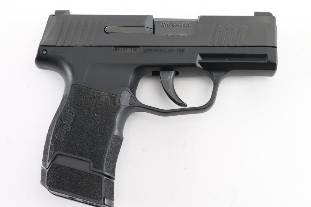 American made semi-automatic pistol, Micro-Compact, Optic Ready, SA, black polymer frame with Nitron finished slide, approximately 3" blued black barrel, bore is excellent/bright, green dot blade front sight, open notch rear sight, SIG Rail accessory rail, no exposed hammer, smooth trigger, textured grips, double stack 10-round magazine. Includes a Sig Sauer plastic case with instruction manual and two extra magazines. (3) total. Near NRA Perfect. Modern Firearm