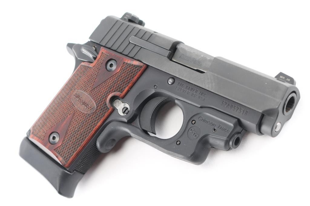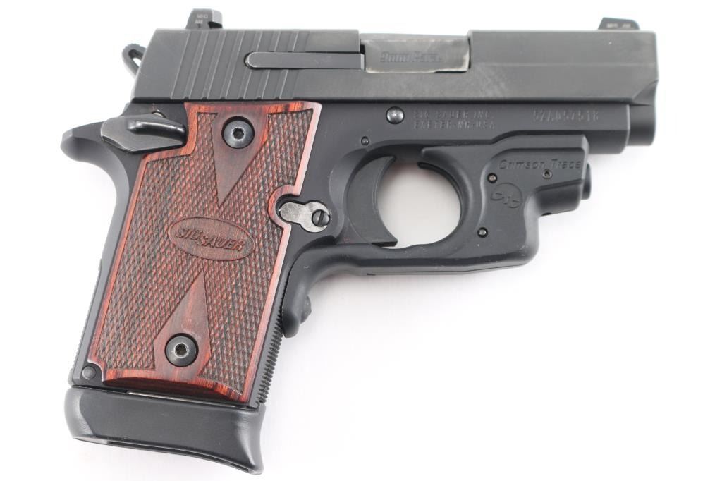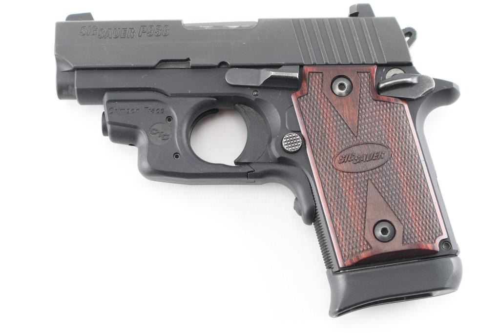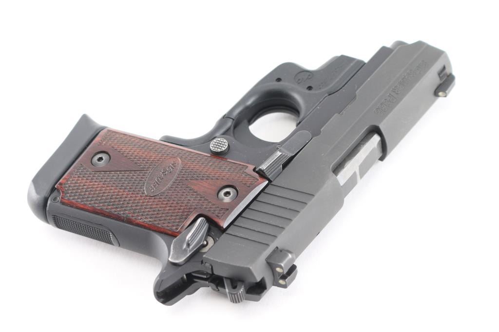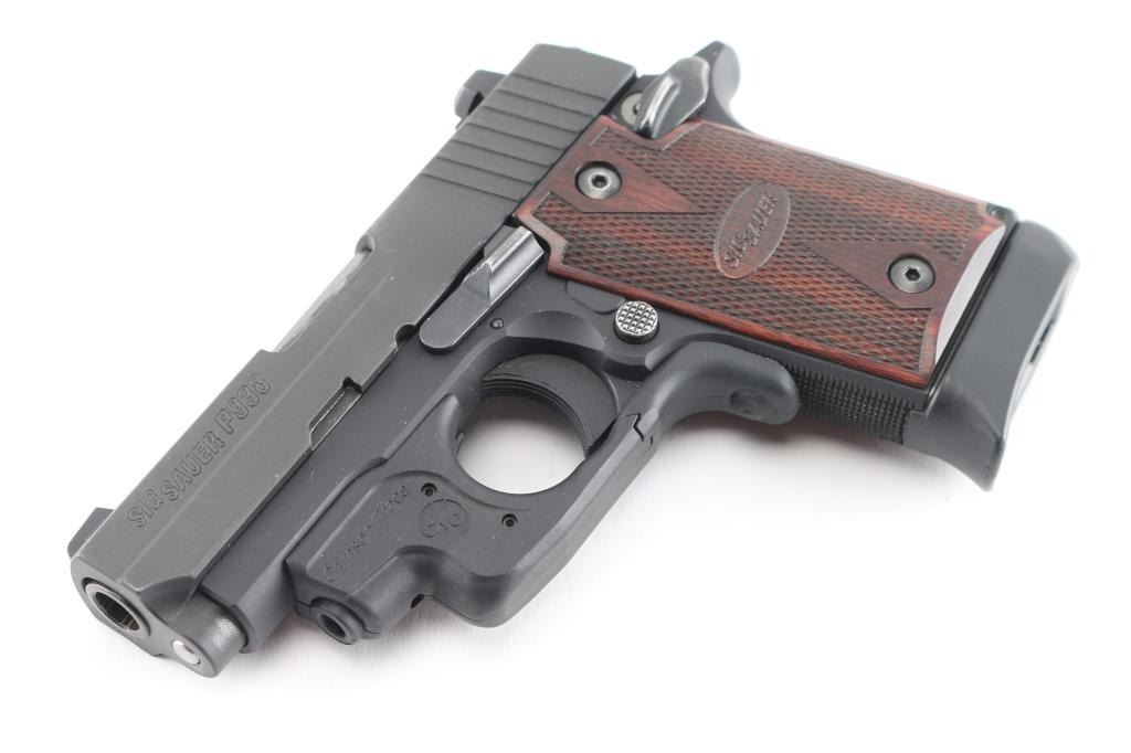 American made single action compact semiautomatic pistol features 3" barrel, fixed MH3 3 dot night sights in dovetails, ambidextrous manual safety, serrated trigger. Knurled straps. Frame finish is matte black, slide is parkerized gray with checkered factory wood grips. Night sights glow in dim light. Crimson Trace red dot laser sight installed on the triggerguard, in good working order. Bore is excellent. Overall condition is like new, with few handling marks. Includes three magazines, two with finger extensions and one flush.NRA Condition-Excellent. Modern Firearm.