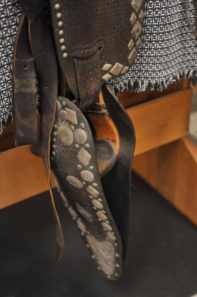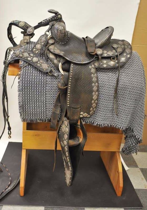 Silver mounted parade saddle belonging to Mickey Eissa who was a western personality that road in early Rose Bowl parades. Beautifully engraved silver horn and gullet signed “Bohlin Made Hollywood Calif.” Theseat is stamped “Hollywood Saddlery LTD, Mickey Eissa (Owner)”. The back of the seat shows a Cheyenne roll in scalloped or fluted design with fancy engraved silver back by same engraver as front. The seat and fendersshow blackened and basket weave carving. Mounted with silver horse heads and diamond all engraved en suite. California style tapaderos with matching silver horsehead and engraved geometric decorations. MatchingBohlin, Hollywood Calif. Signed bit and headstall with long and fancy reins engraved silver mounts with horse heads, conchos, geometrics and fancy silver studs. Some leather pieces are signed Bohlin Hollywood.Also silver mounted 6 ft. reins with drops engraved and raised horse head matching silver breast piece showing same designs as saddle, fenders and headstall. The saddle is in as found in the barn condition needing