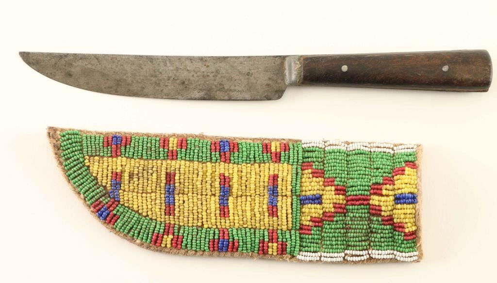Hide scabbard with fully beaded geometric design on one side with green, red, white, and blue glass trade beads. The other side has a painted geometric design. The knife has a wood handle, unmarked measures 9" overall with a 5" blade.