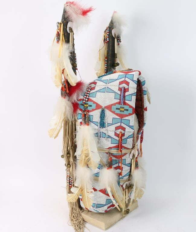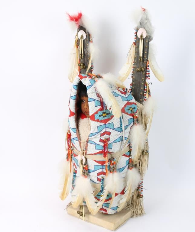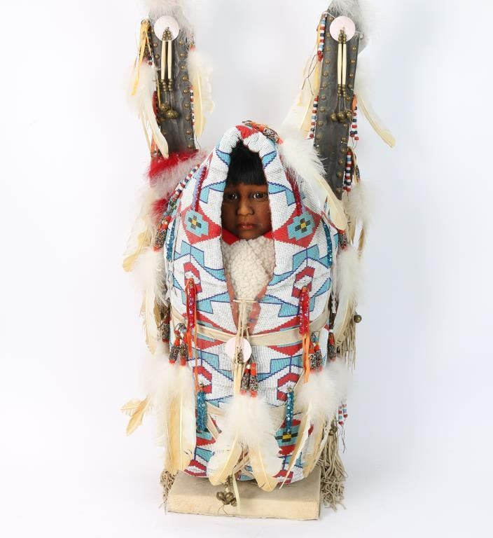 2oth century type craddle board on stand. White, blue, red and yellow beaded. Decorated with bells, horn beads, glass beads and feather. Measures: 41"H x 17"W x 12"D