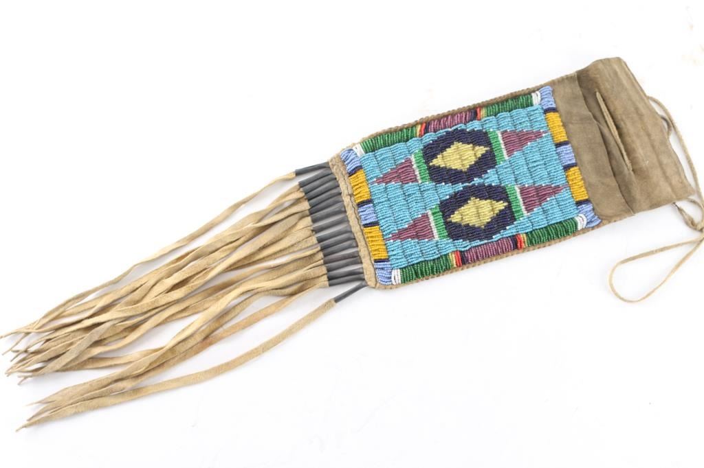 Fully beaded antique Sioux Indian bag, measures 35" overall, with a 14 1/2" shoulder length, bag measures 9x5, the fringe measures 11", and is in good overall condition for the age.
