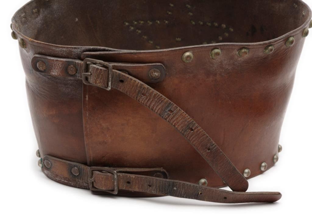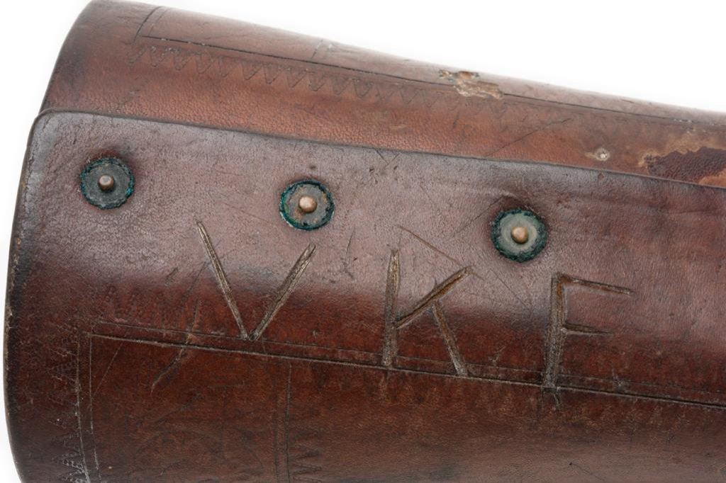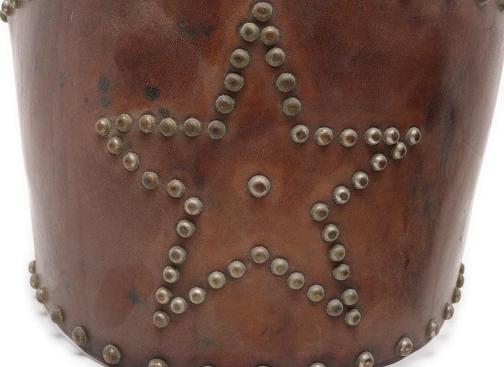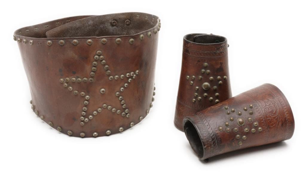 Six inch wide leather bronco belt with pair of leather forearm cuffs, all decorated with “buttons” including matching 5 point stars. The cuffs are also floral and border tooled. “VKF” initials scratched into one of the cuffs. Est.: $125-$250.