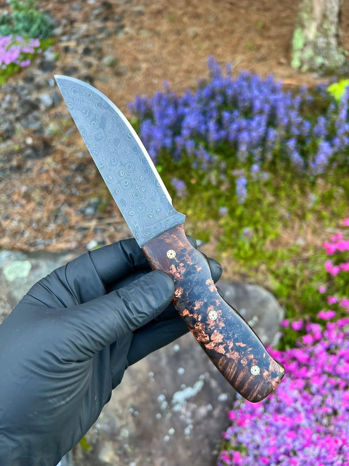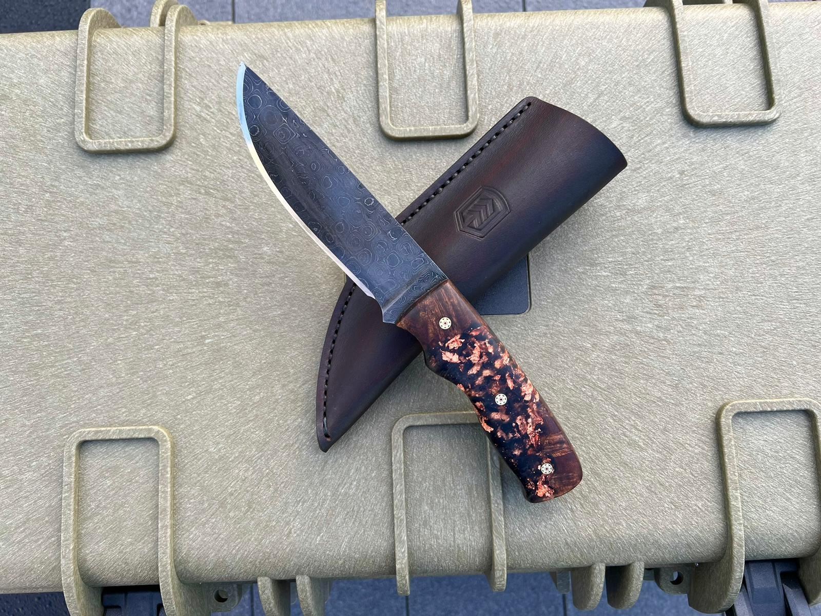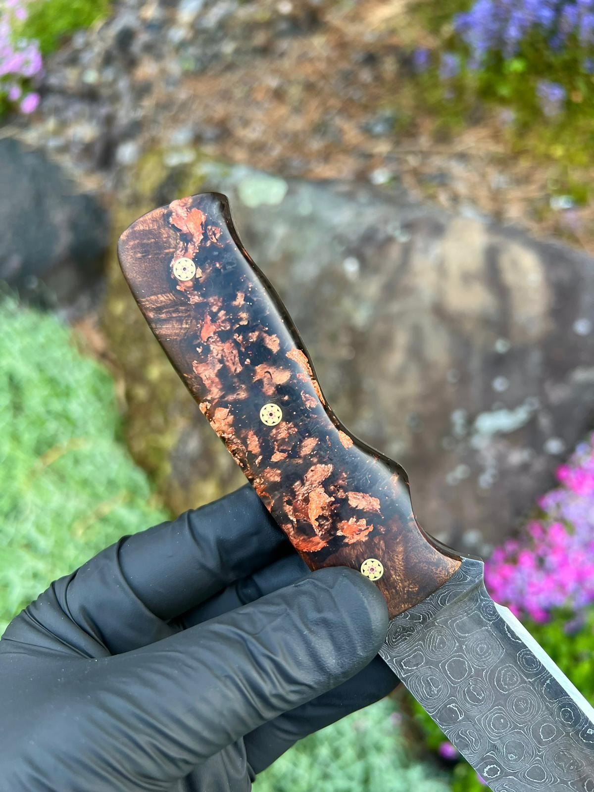 This set includes a custom handmade knife made from American made Damascus steel comprised of 5160, 15n20, Ni200 and folded to make 416 layers. This knife undergoes a professional industrial heat treat and is