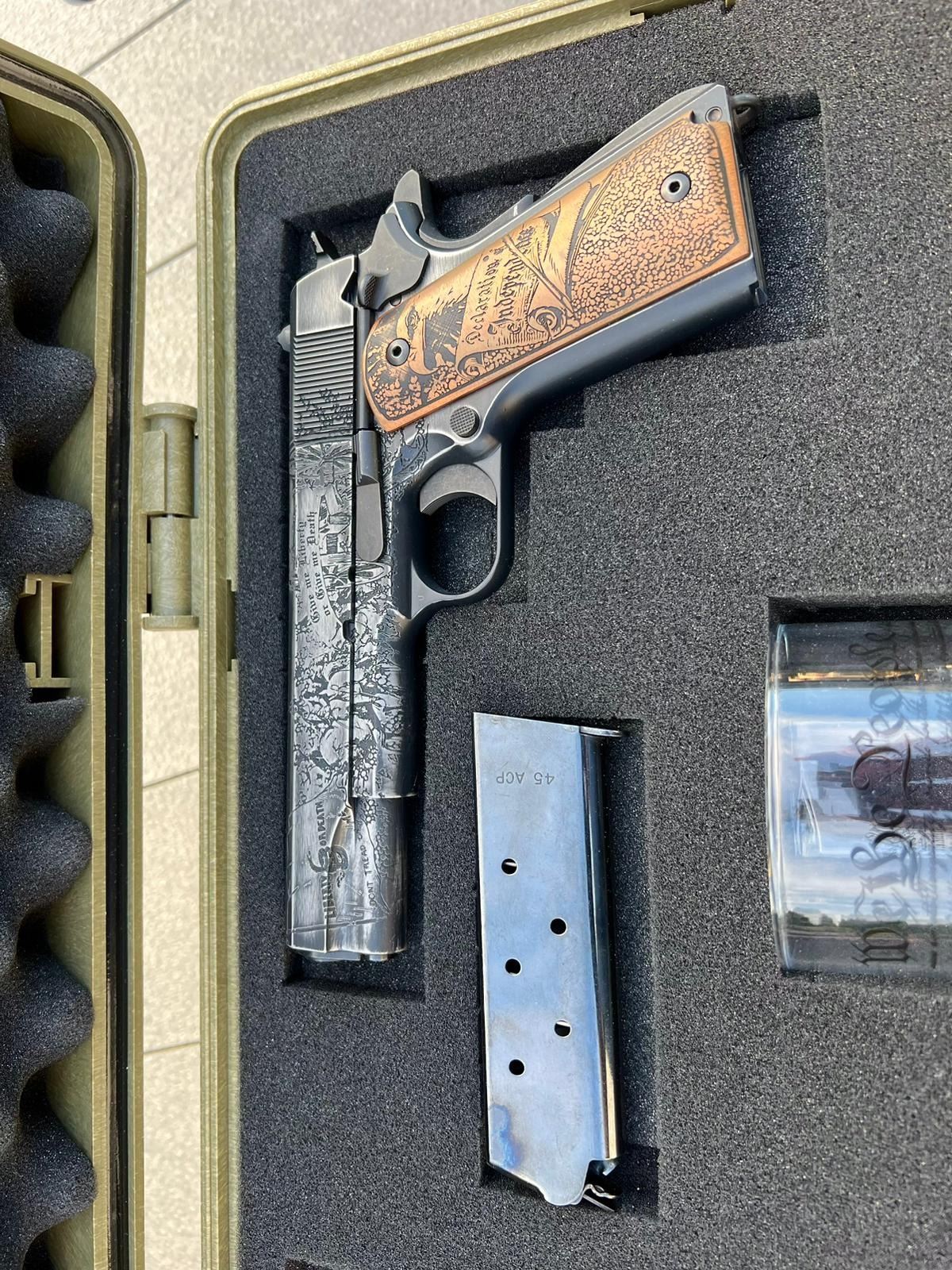 The Camp Freedom Custom Shop and Smackrell Outdoors present a one of a kind custom set. This set is outfitted with an Auto Ordinance Revolution Special Edition 1911 in .45ACP. This firearm includes solid copper engraved grips, fully engraved slide and is finished in a distressed