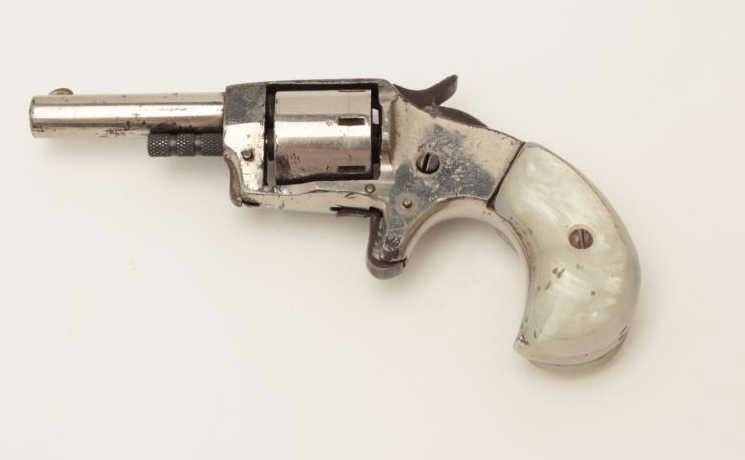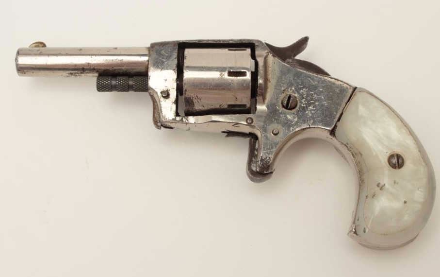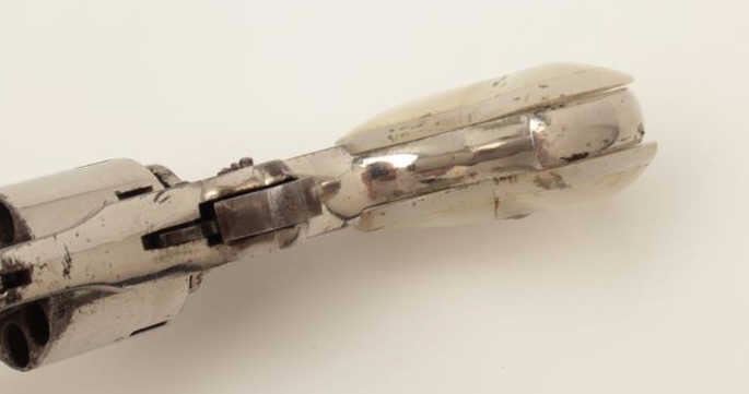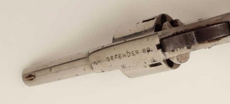 Small pocket spur trigger revolver marked “DEFENDER 89”; .22 caliber, 2.25” barrel, nickel finish, faux pearl grips, no visible S/N. Revolver shows considerable original nickel finish with knackering on the rightside of the frame; action not working at present. (Antique). Est.: $75-$150.