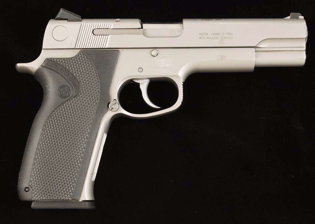 Scarce stainless steel full-size double action semi-automatic pistol chambered in 10mm. 1 of only 3,135 produced. Features a satin finish, 5" barrel, Novak three-dot fixed sights, beavertail frame with serrated front strap, de-cocker lever, push button magazine release on right side. bobbed hammer, smooth trigger, 9 round factory magazine and Smith & Wesson wrap-around black Delrin grips. Includes a black soft case. Pistol shows moderate holster wear. Action is strong, bore is bright and grips are fine. Condition is very good. ***Modern Firearm***