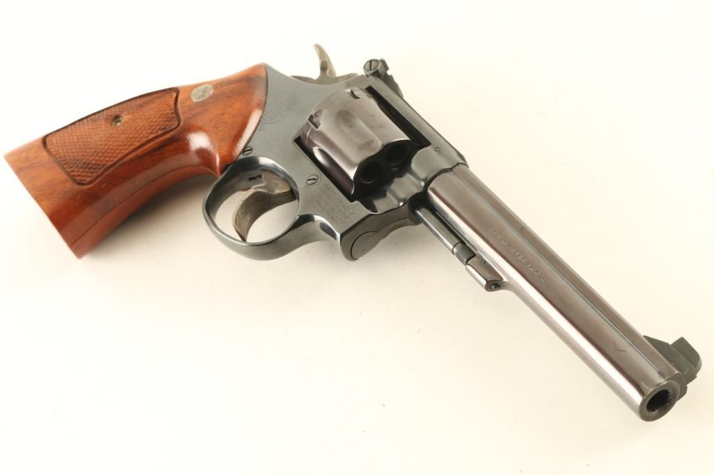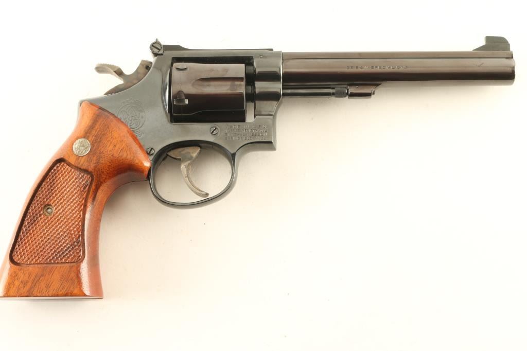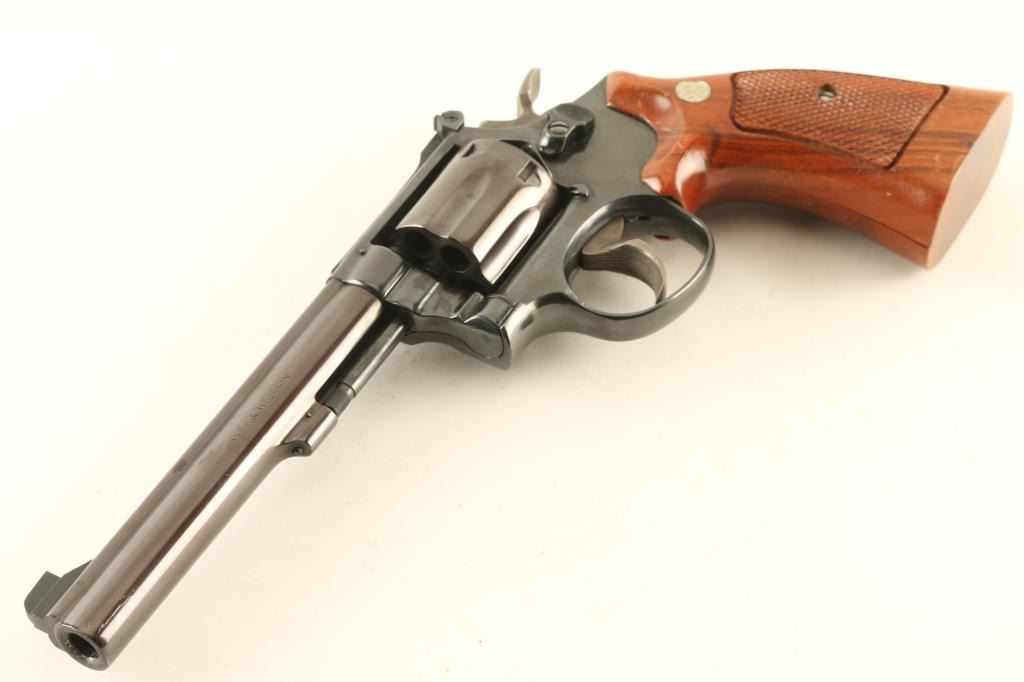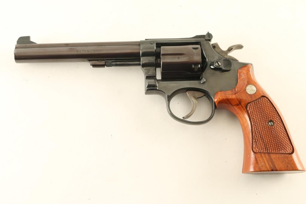 Revolver. 6-rd capacity. Built on a medium-size K frame. Double action. 6" ribbed barrel with ramped blade front, and adjustable notch rear sights. Pinned barrel, serrated trigger. Extra wide hammer spur. Checkered walnut grips with S&W medallions. Case-hardened hammer. Blued frame. Plum colored cylinder, and barrel. Bore , and cylinders appear very good, but a little dusty. Action is crisp/tight. Revolver has been re-blued. Grips are excellent. Metal finish has a few minor scratches, with some tracking lines on the cylinder. NRA Condition-Very Good as re-blued. Modern Firearm.