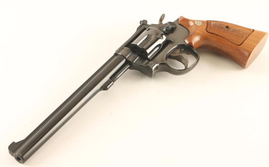 'K-22 Masterpiece' Medium frame double-action revolver chambered in .22 Long Rifle, circa 1977-1982. Features a blued finish, pinned 8 3/8" barrel with serrated top rib, ramped patridge front sight, adjustable micrometer click rear window sight, fluted six-shot cylinder with recessed chambers, non-shrouded ejector rod, .500" target trigger, .500" target hammer, square butt K target frame with ten groove grip straps, and two-piece checkered walnut target grips with silver Smith & Wesson medallions. Includes the original factory cardboard box with documents and cleaning tools. Revolver exhibits approximately 99%+ of it's original blued finish with only a faint drag line on the cylinder observed. Action is smooth with tight lock-up, bore is excellent, and wood grips are fine. Condition is near new in box. ***Modern Firearm**