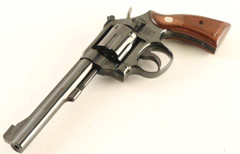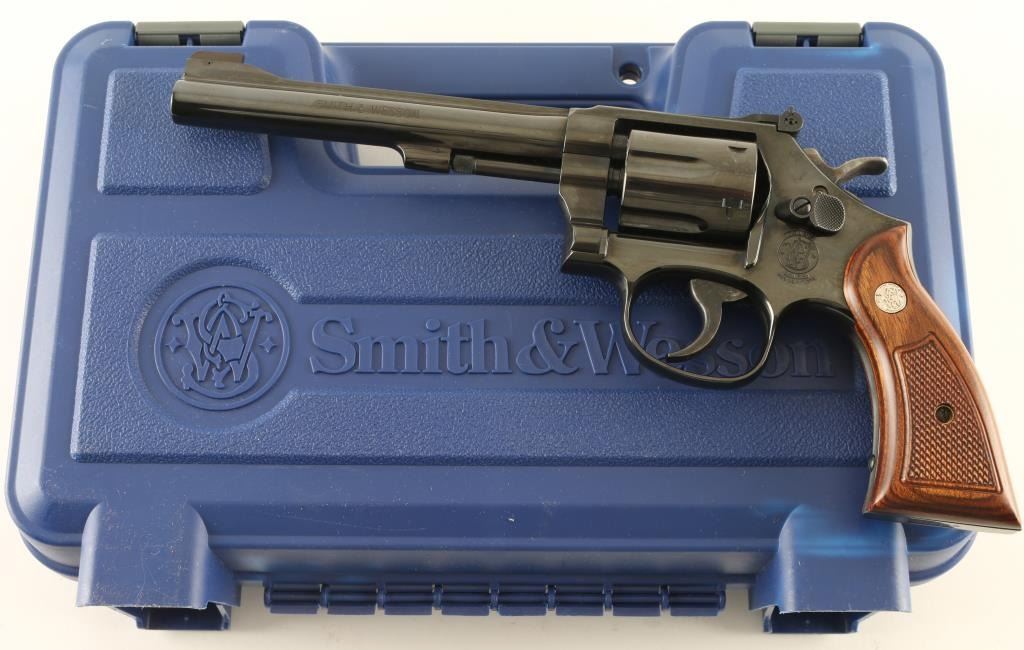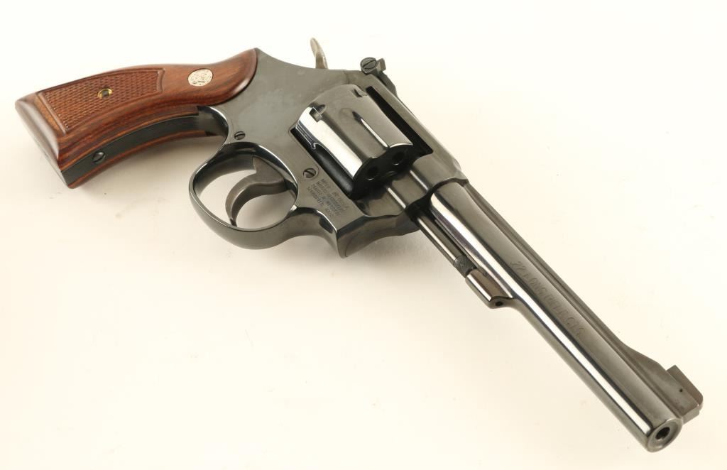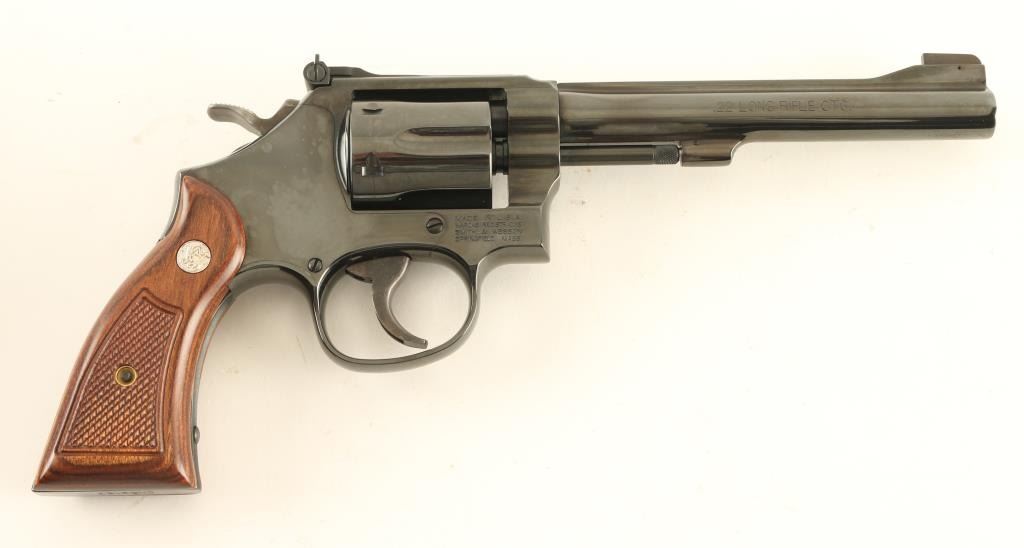 Double/single action rimfire revolver features blued finish, checkered wood "Magna" grips with S&W medallions, 6" barrel, adjustable sights (Partridge type front sight), case colored smooth narrow trigger, case colored checkered medium width spur hammer, S&W internal lock system. Bore and charge holes are excellent. Overall condition is like new with few signs of handling or use, slight drag line on cylinder. Action is smooth, lock-up is tight. Includes blue plastic factory foam lined case with manual. Condition is NRA Excellent - like new *** Modern Firearm ***