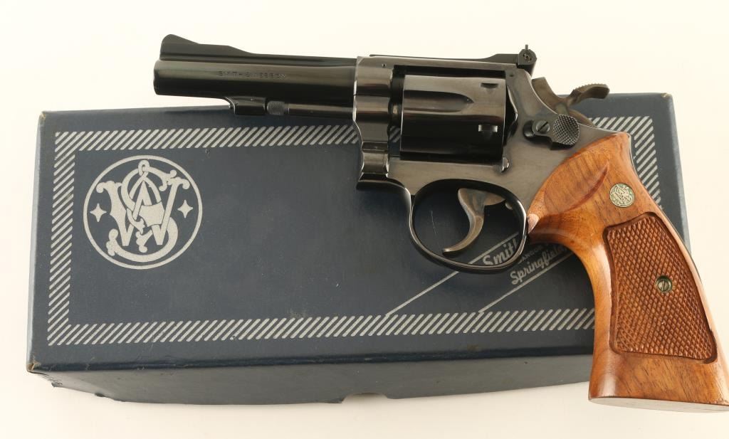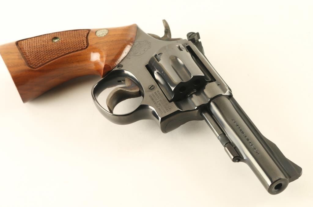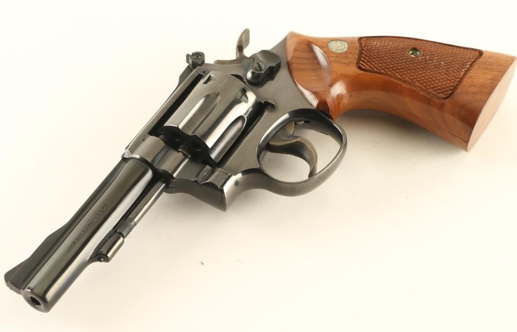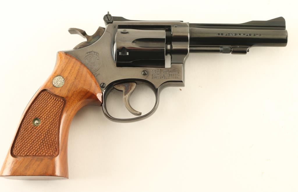 Double/single action rimfire revolver manufactured circa 1977. Features blued finish, checkered wood target style grips with S&W medallions, 4" barrel, adjustable sights, 6 shot cylinder, grooved wide case colored trigger, checkered wide spur case color hammer. Bore and charge holes are excellent. Retains 98% blue with some thinning or bare metal at drag line, sharp edges, ejector rod. Grips are excellent. Action is smooth with tight lock-up. Includes factory box (blue/silver cardboard) in fair to good condition. Condition is NRA Excellent *** Modern Firearm ***