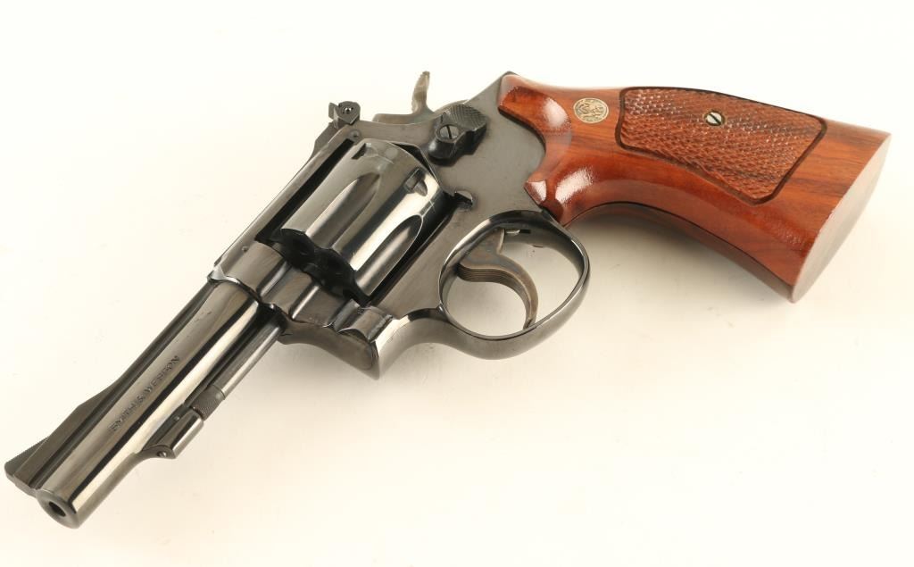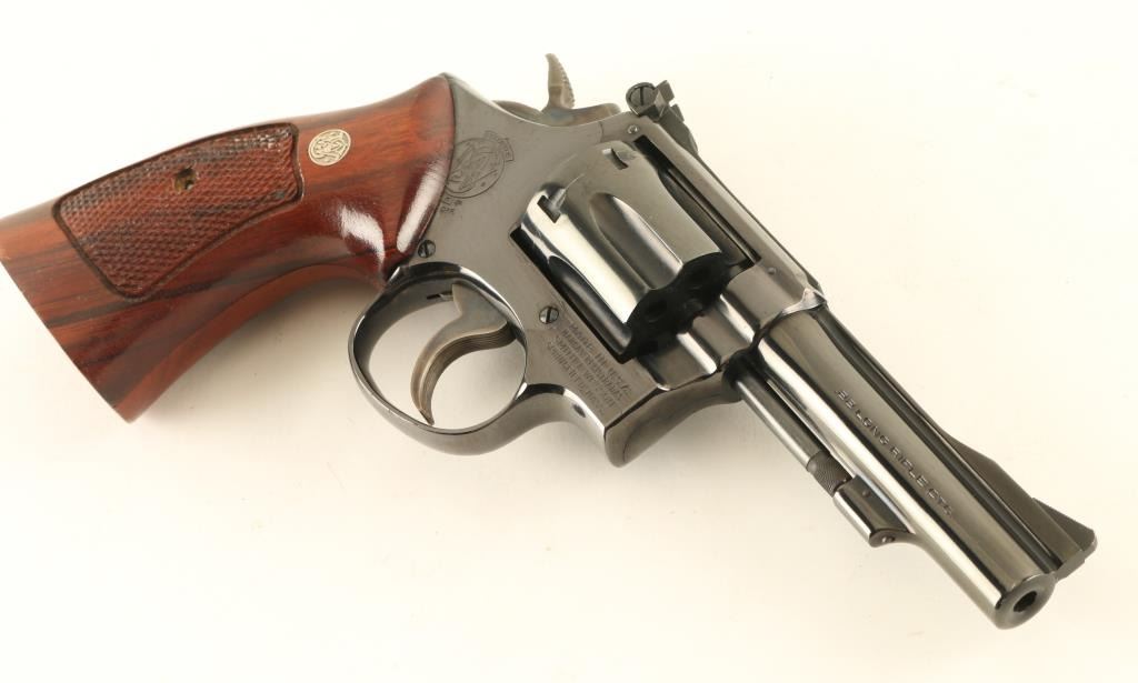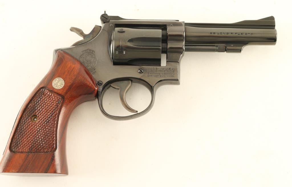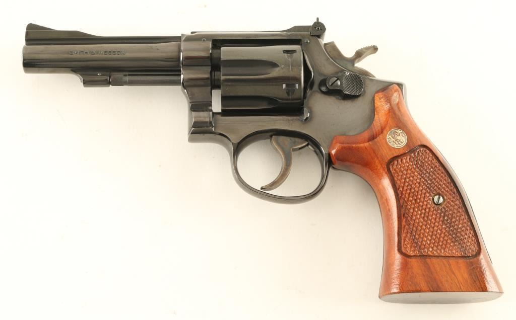 'The K-22 Combat Masterpiece' double/single action revolver manufactured circa 1973. Pinned barrel & recessed cylinder for cartridge rims. Features blued finish, checkered wood target style grips with S&W medallions, 4" barrel, adjustable sights (ramp front, white outline rear), case colored grooved narrow trigger, case colored checkered medium width spur hammer. Bore and charge holes are excellent condition. Retains 95% blue with bare metal showing at edges of muzzle & cylinder drag line, small spots of patina in a few places on left side. Grips are very good to excellent condition. Action is smooth, lock-up is tight. Condition is NRA Very Good ++ *** Modern Firearm ***