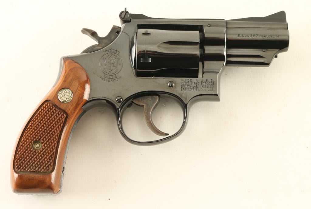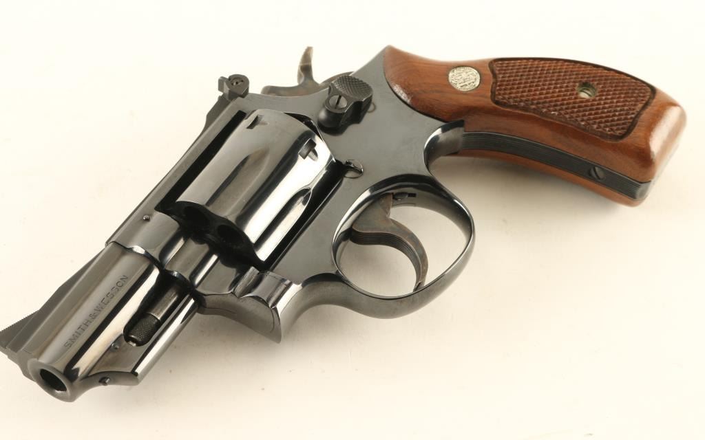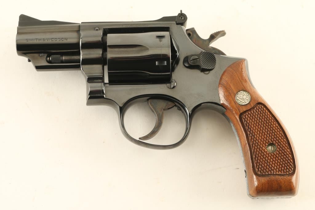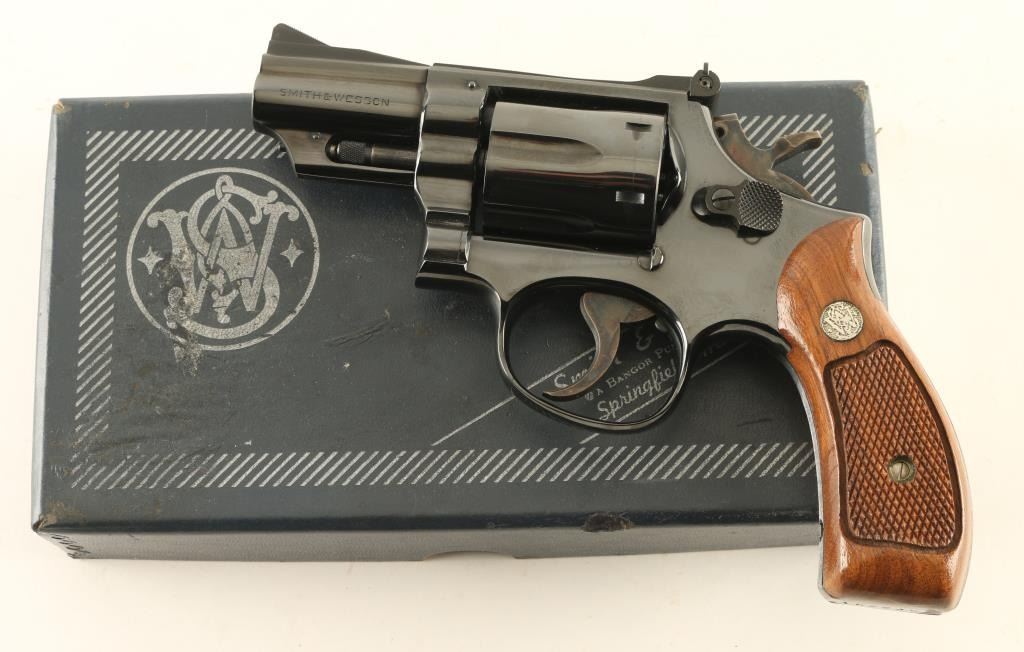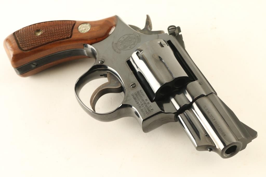 Double/Single action revolver features blued finish, checkered wood "magna" style grips with silver "S&W" medallions, 2.5" barrel, adjustable sights, round butt. Bore is excellent. Overall condition is almost like new with 98% blue, faint cylinder drag line, slight wear to blue on ejector rod. Includes blue/silver factory cardboard box (numbered to gun) with cleaning rod/brush/mop, factory paperwork. Condition is NRA Excellent *** Modern Firearm ***
